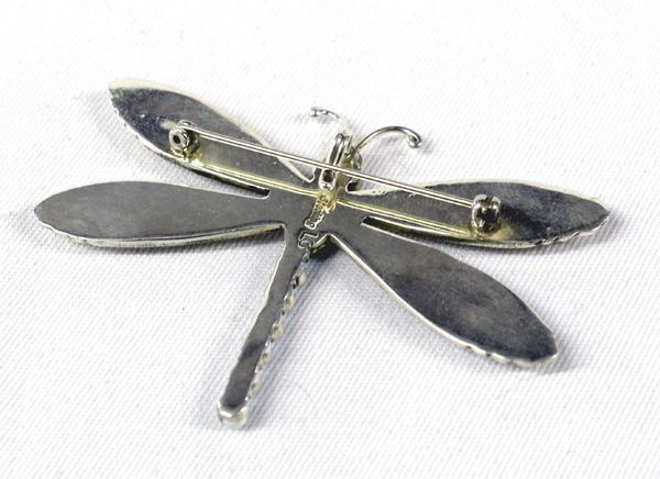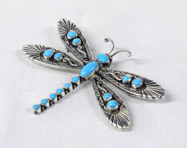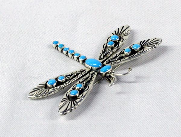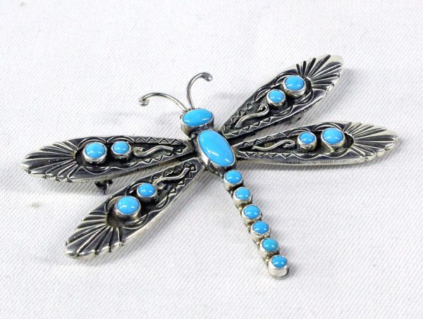Navajo Sterling & Turquoise Pin/Pendant, Signed by Lee Charley. A showpiece of Navajo craftmanship in this dragonfly pin/pendant by Lee Charley.  Oval and round polished turquoise cabochons are predominant in this design.  Nice substantial piece. Stamped ''LC'' ''Sterling'', measures 2'' high x 2.75'' wide.