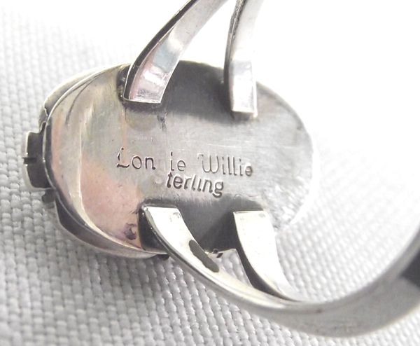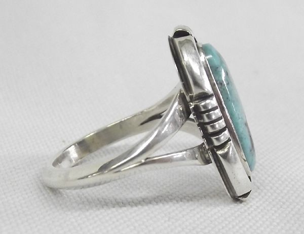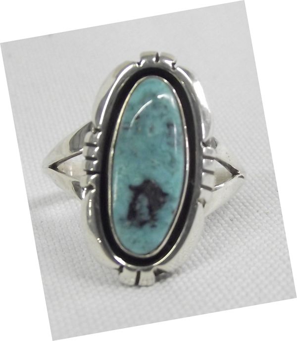 Navajo Sterling Turquoise Ring -- Connie Willie, beautiful shadow box style setting with oval turquoise cabochon, dark brown matrix, double band shank which tapers down to one band, size 8.5 and measures 1'' x .5'', stamped Connie Willie Sterling