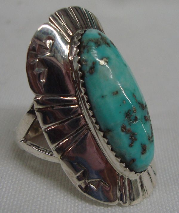 Native American Navajo Sterling Silver Turquoise Ring - Edison Begay. Hallmark ''EB'', size 10. Top of ring measures approx. 1 1/4''L x 1''W. Turquoise measures approx. 1''L.
