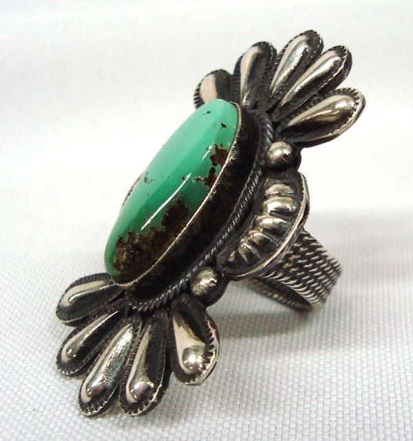 Native American Navajo Sterling Turquoise Ring - Jesse Martinez. Sterling silver setting holds a beautiful green turquoise oval shape cabochon. Ring size is 8.25''. Setting measures 1-7/8'' x 1-1/8''. The cabochon measures 7/8''x3/8''.