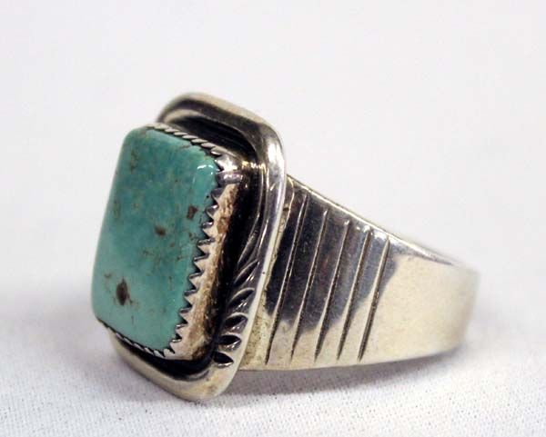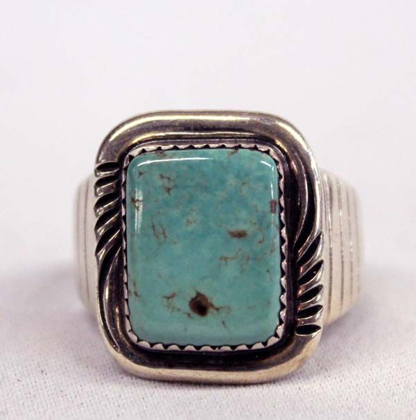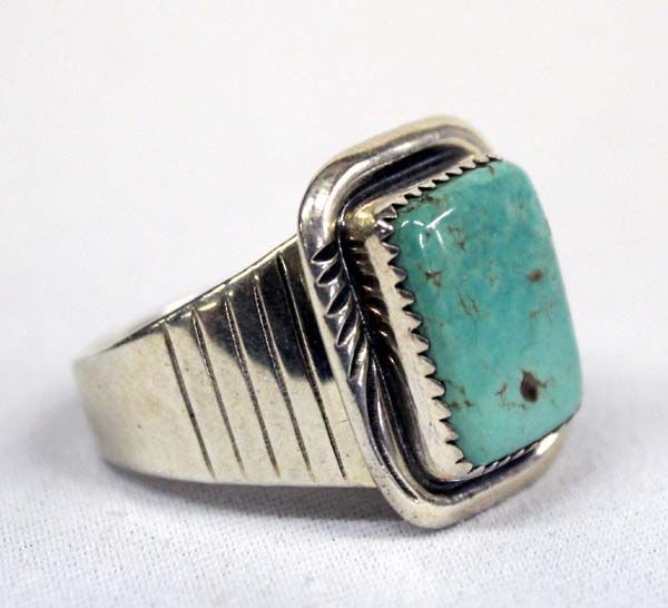 Navajo Sterling Turquoise Ring, Size 12.5 by Will Denet-Dale, gorgeous blue green turquoise stone measures 5/8'' x .5'', beautifully carved wide shank which tapers down, hallmarked W. Denet-Dale and stamped sterling, 12.49g in total wt.