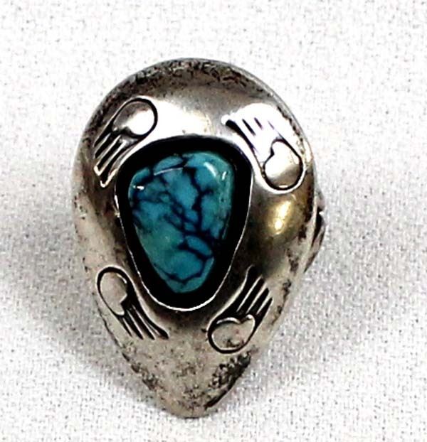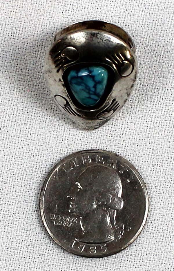 Native American Navajo Sterling Turquoise Ring by Chief Dodge, Size 6.5, measures 1.5''L x .75''W, shadowbox style, hallmarked and stamped sterling, hand stamped details, FYI: ''Chief Dodge Indian Jewelry and Fine Arts: shops in Scottsdale and Tempe AZ, selling Native American artisans on-site.''
