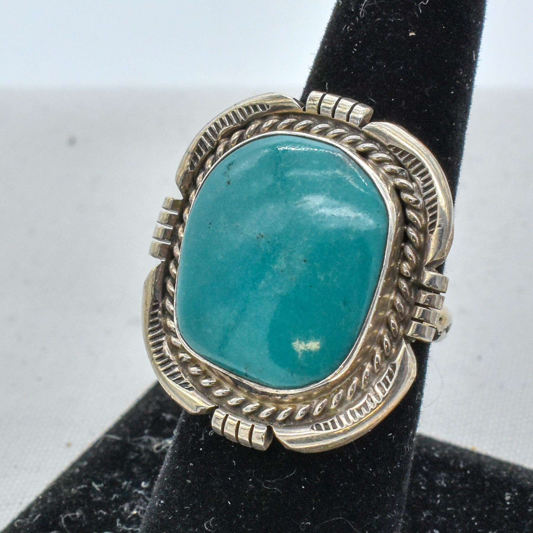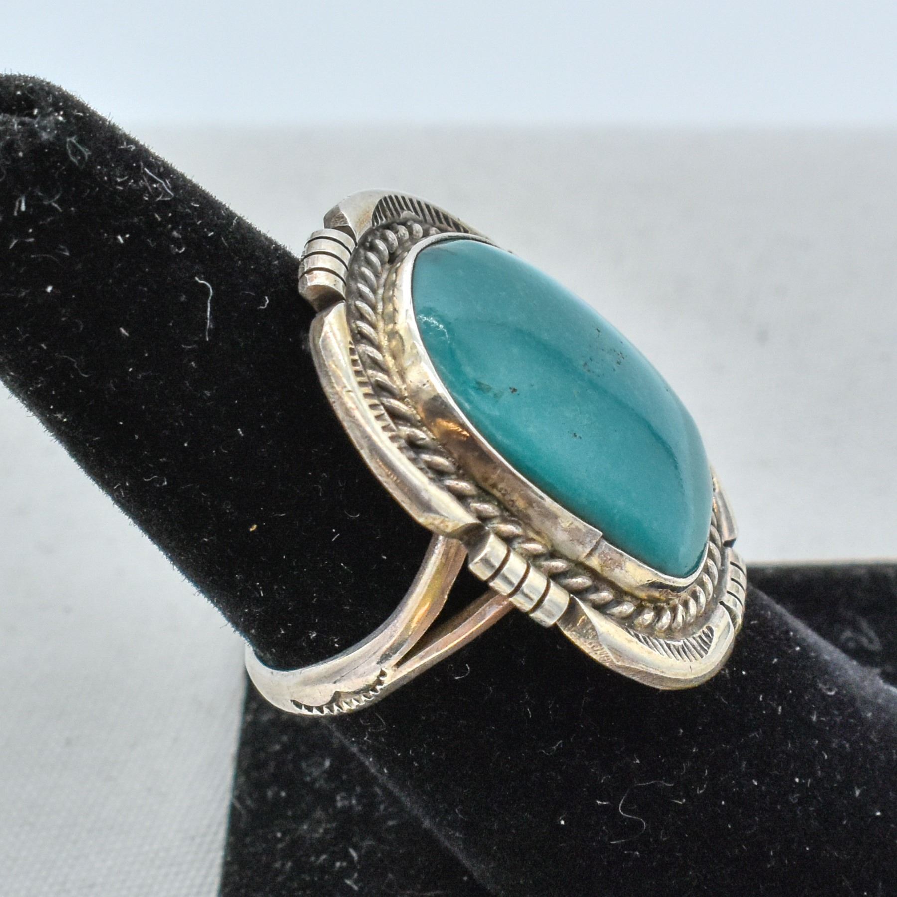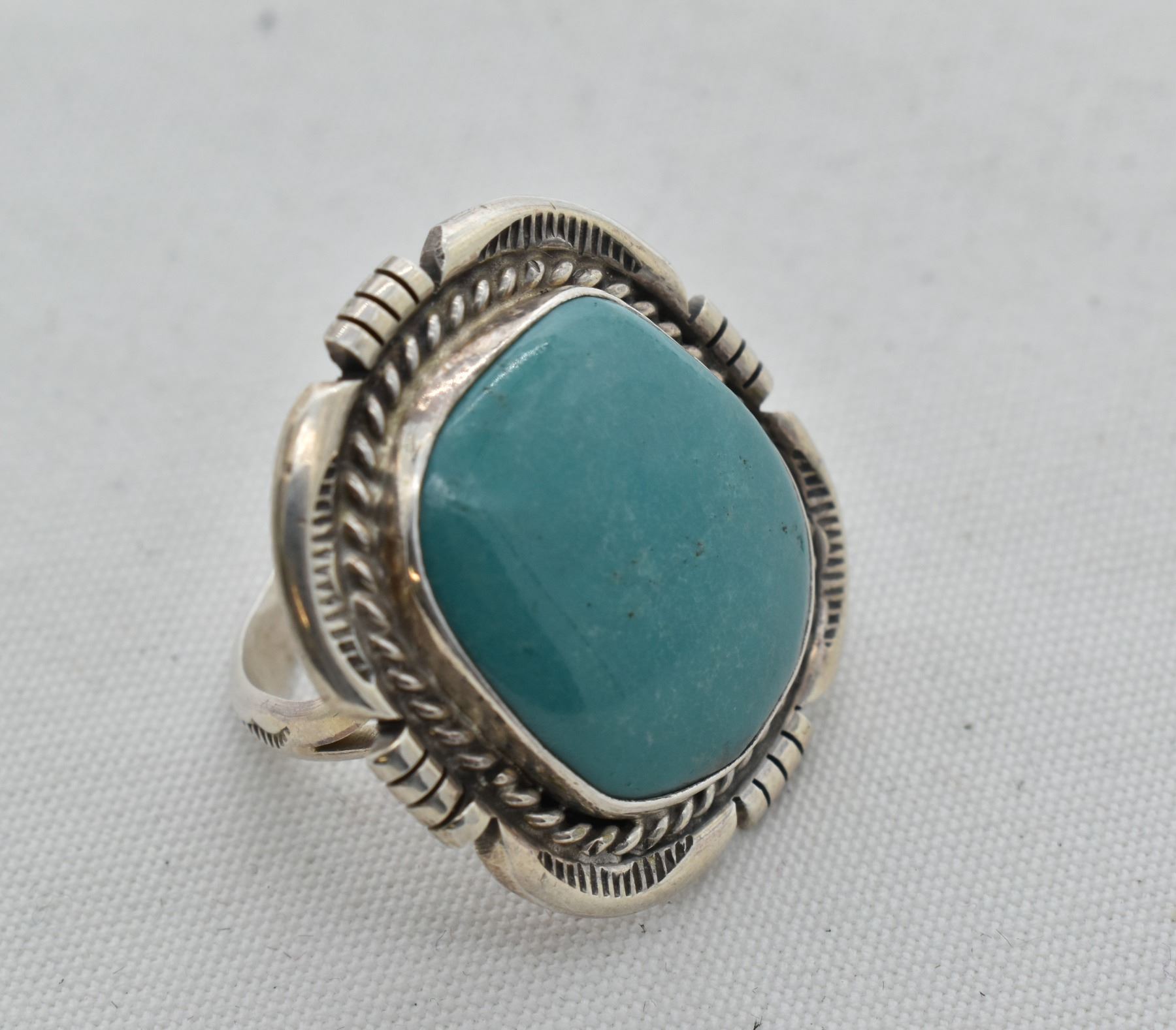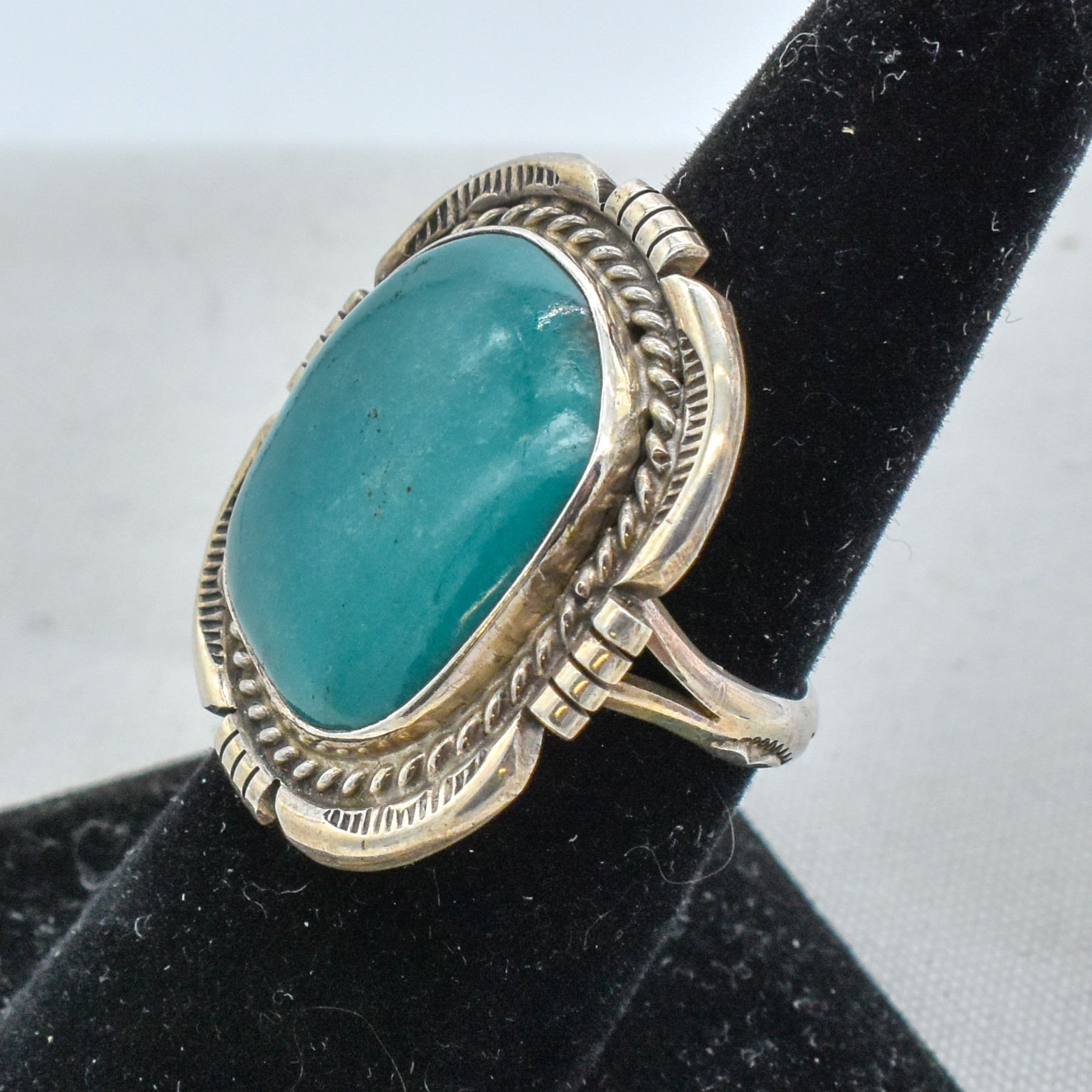 Native American Navajo Sterling Turquoise Ring by Billy Slim, Size 8, measures 1.25''L x 1''W, hallmarked B and stamped sterling