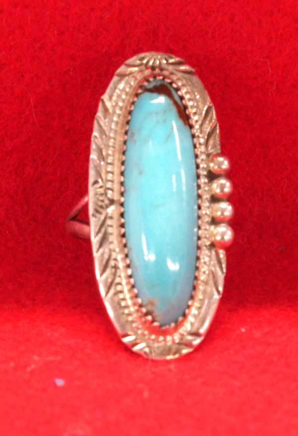 Navajo Sterling Turquoise Ring by Franck & Louise Yazzie, hallmarked FY, beautifully carved edging, features sawtooth bezel set bright Bisbee Blue Turquoise cabochon measuring 1 1/8''L x 3/8''W, double band shank which tapers into one, has vein of brown matrix running across end of stone, 9.34g in total wt.