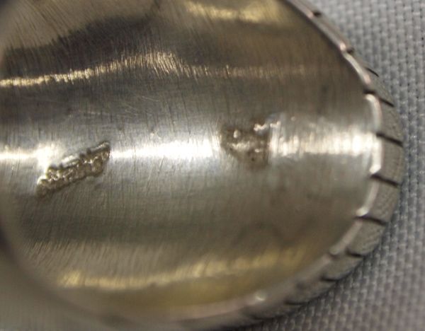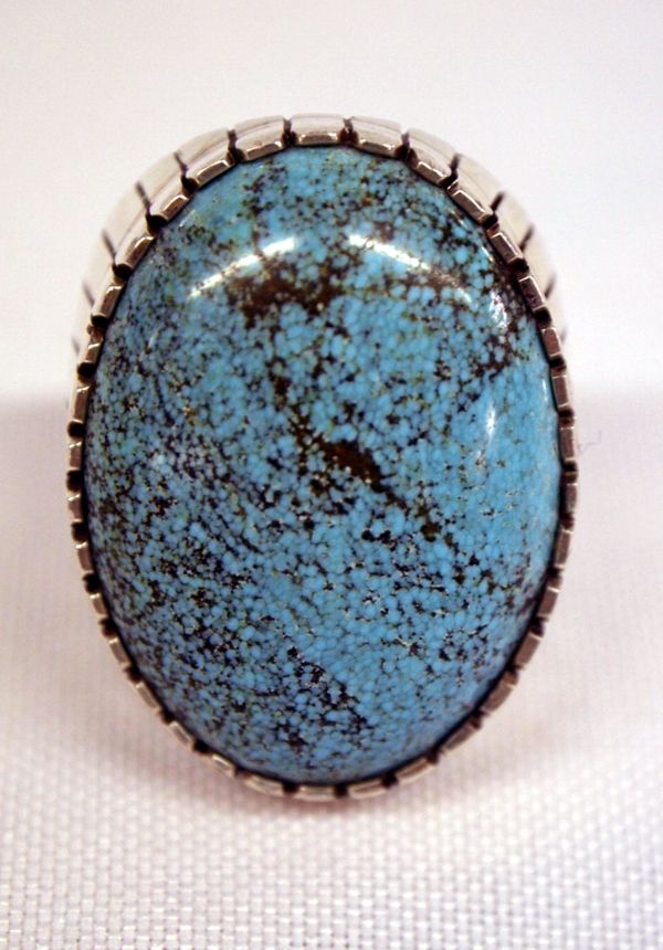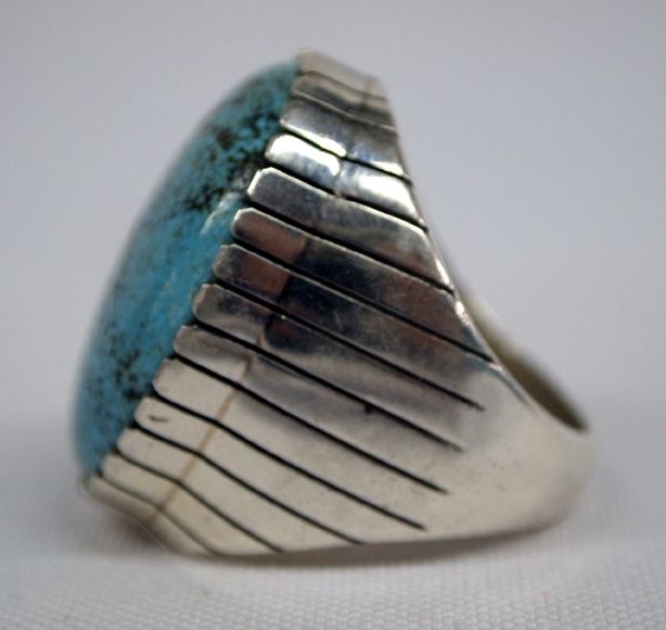 Navajo Sterling Turquoise Ring hallmarked JC and stamped sterling, pale blue oval cabochon (1 1/8'' x 7/8'') with light brown matrix set in a scalloped setting accented with line designs, size 12.5