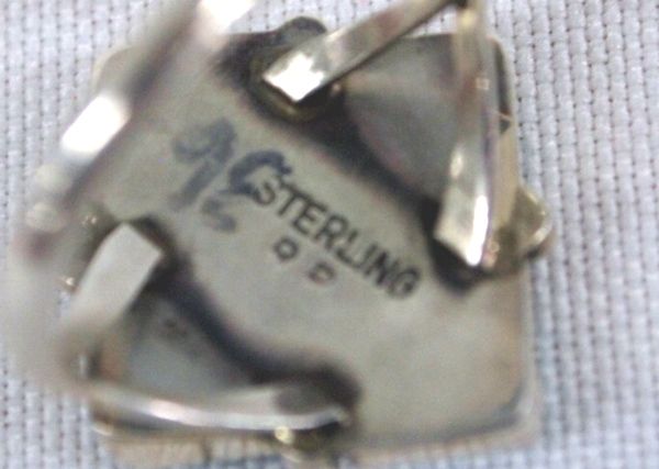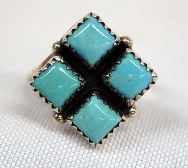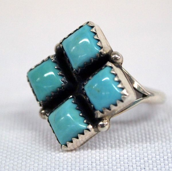Navajo Sterling Turquoise Ring, features 4 diamond shaped blue green turquoise cabs accented with silver beading, 2 band shank which tapers down into one, unreadable hallmark, size 8.5 and measures 5/8'' x 5/8''