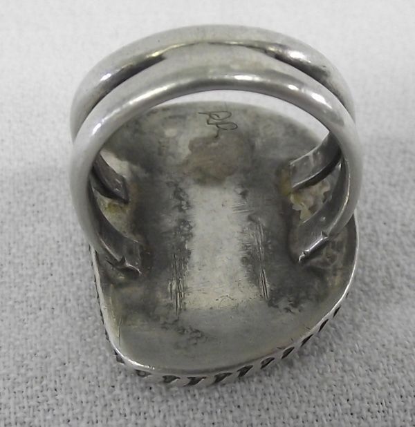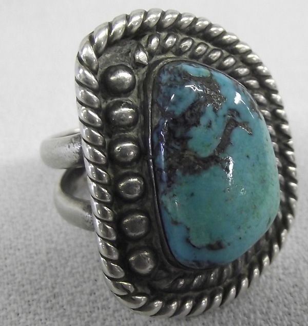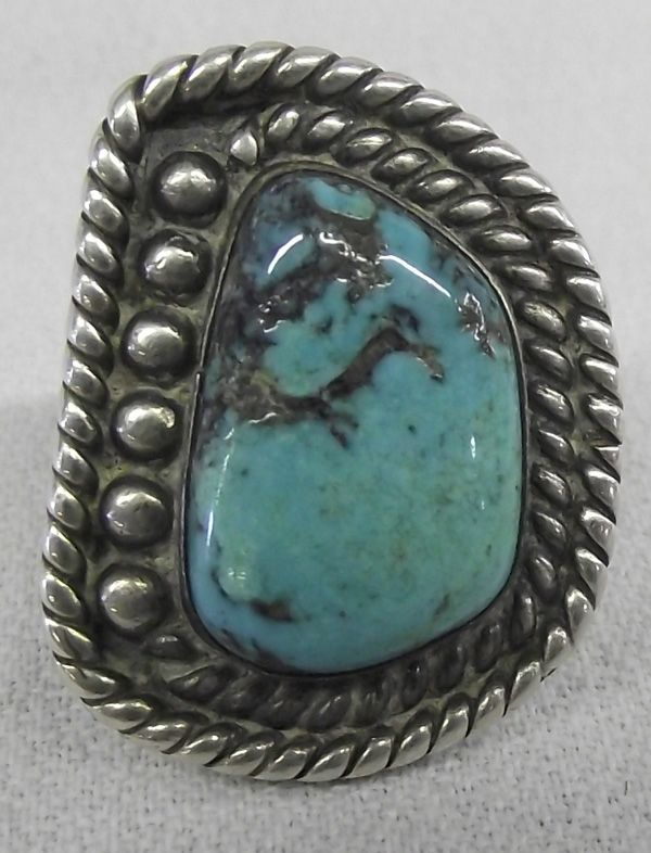 Navajo Sterling Turquoise Ring, traditional designed setting of twisted silver rope and bead accents, double band shank, size 8 and measures 1 1/8''H x 1''W, cabochon measures .5'' x .5''
