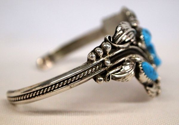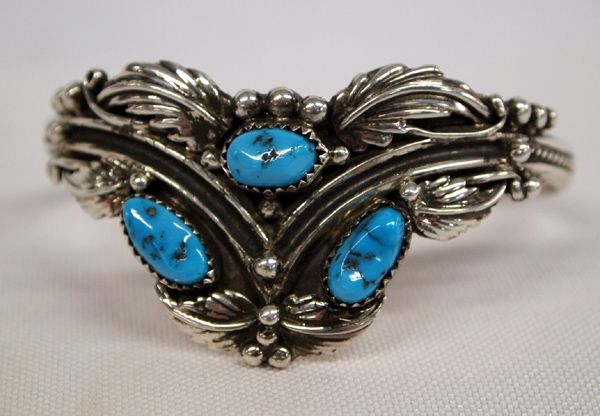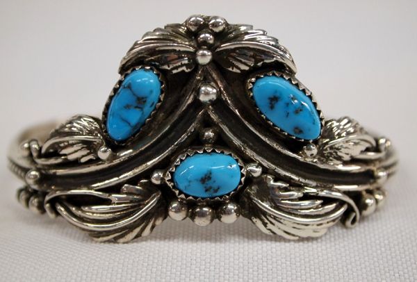 Navajo Sterling Turquoise Sleeve Cuff Bracelet, 3 gorgeous deep blue turquoise cabochons with black matrix set in a traditional setting of leaves and silver beads, single band bracelet with twisted silver rope accent, inside measures 6 3/8'' which includes opening x 1.25''W