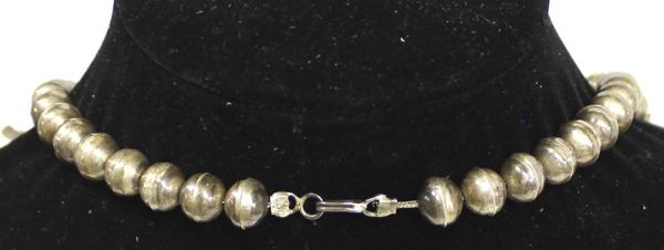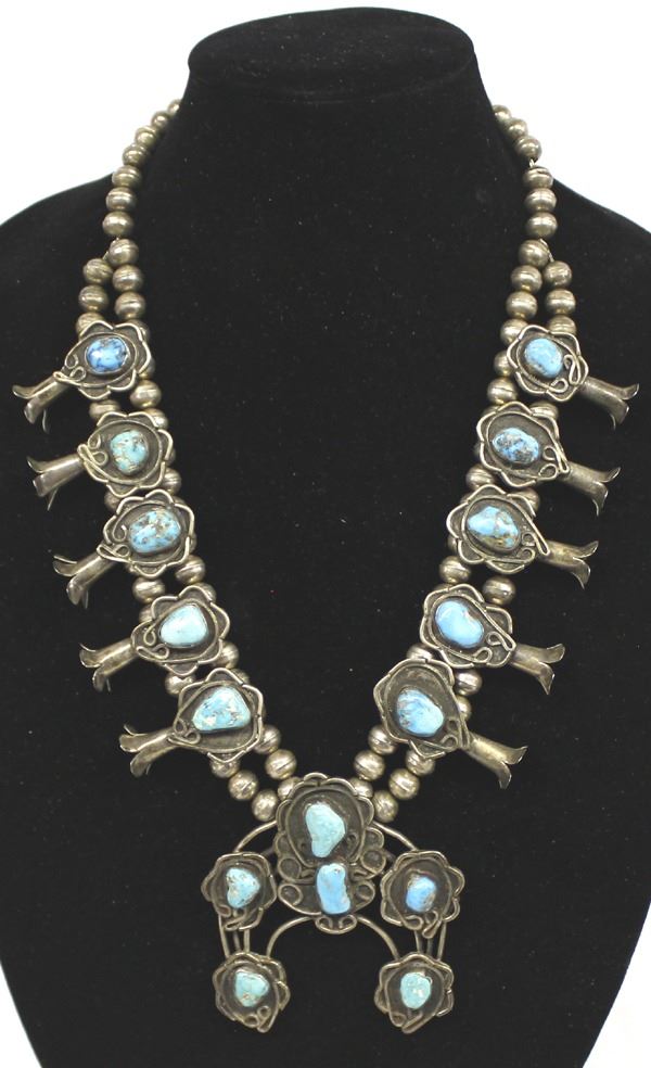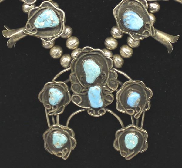 Vintage Native American Navajo Sterling Turquoise Squash Blossom Necklace, measures 26''L end to end, naja measures 4'' x 3.25'', blossoms measure 2'' x 1'', blossoms and naja hang on double strands of hollow sterling beads, largest turquoise cab measures .75''L, Fabulous older squash blossom necklace