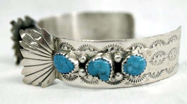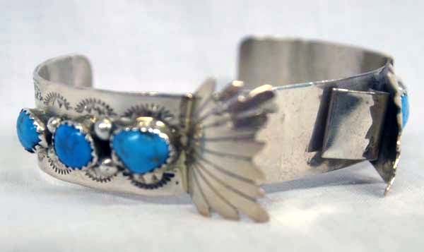 Navajo Sterling Turquoise Watch Bracelet, inside measures 7'' which includes opening x 7/8''W, this beauty features 6 Bisbee Blue Turquoise cabochons measuring .25''D, hand stamping, and silver bead accents, stamped sterling, 31.8g in total wt.