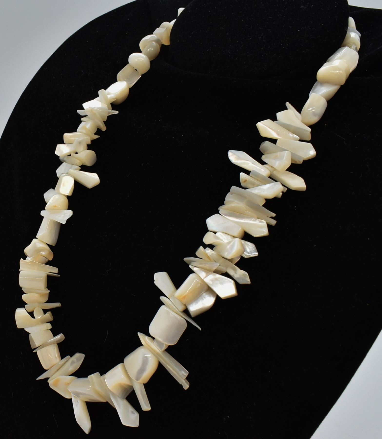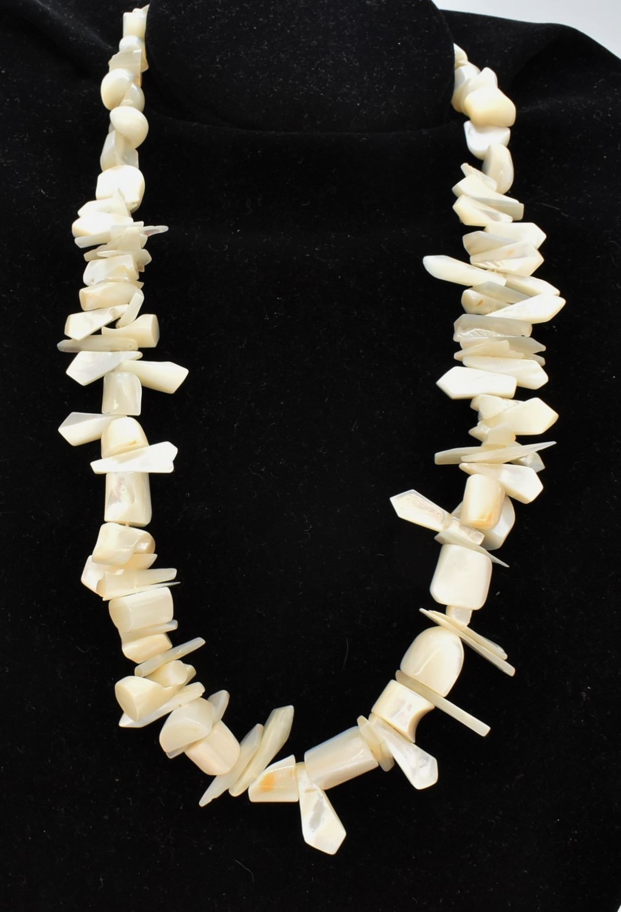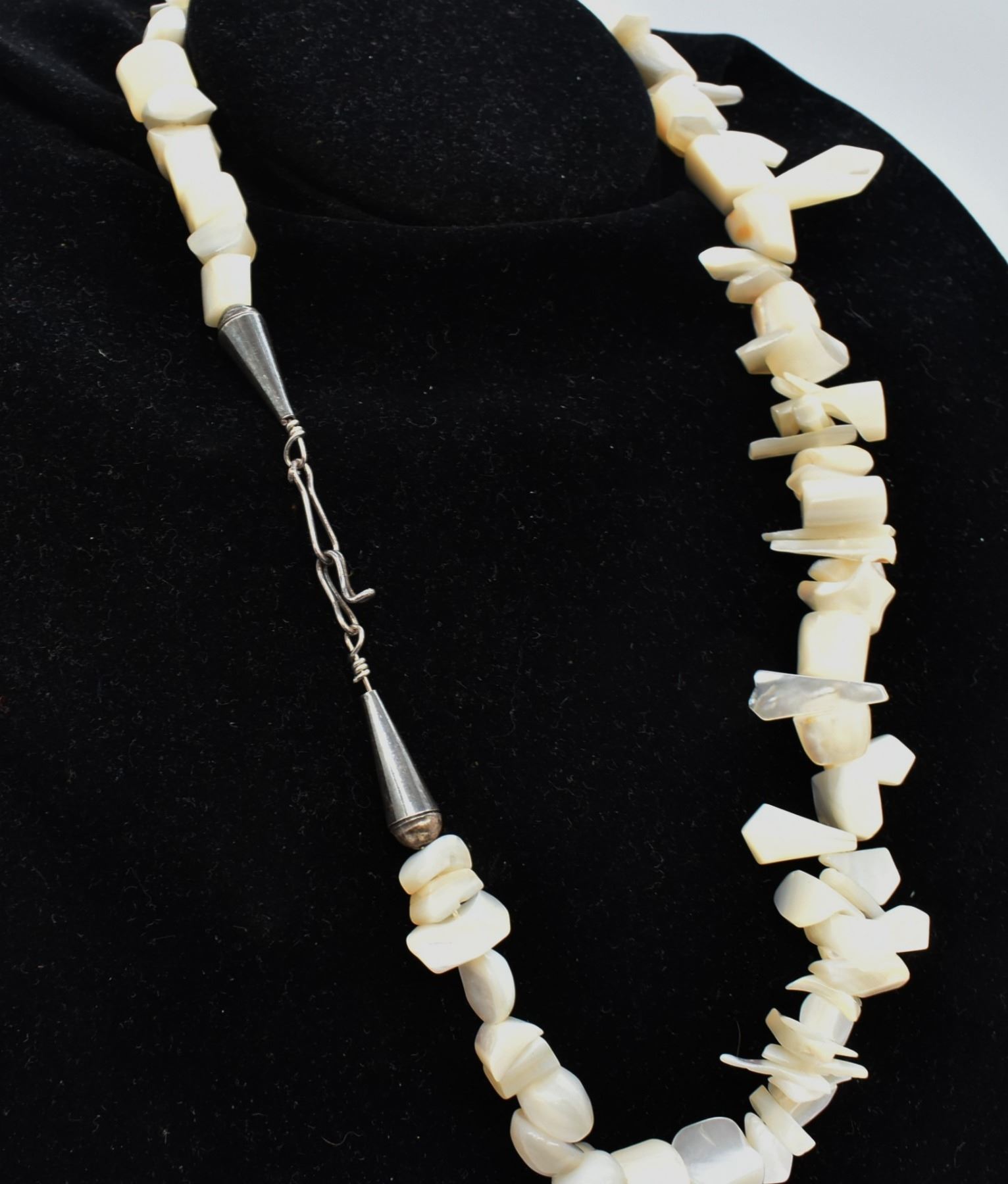 Native American Navajo Sterling and Mother of Pearl Necklace, measures 23''L end to end, largest bead measures 1.25''L, total gram wt. of 136.7, sterling cones and 2 sterling beads near clasp