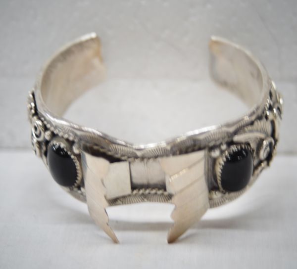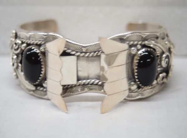 Navajo Sterling and Onyx Watch Bracelet by Celina Yazzie, hallmarked Y and stamped sterling, inside measures 6 3/8'' which includes opening x 1''W, features 2 oval onyx cabochons measuring .5''D, very beautiful traditional setting of leaves, scrollwork, flowers, and silver bead accents, stunning hand stamped edging, 47.5g in total wt. Truly a work of art!