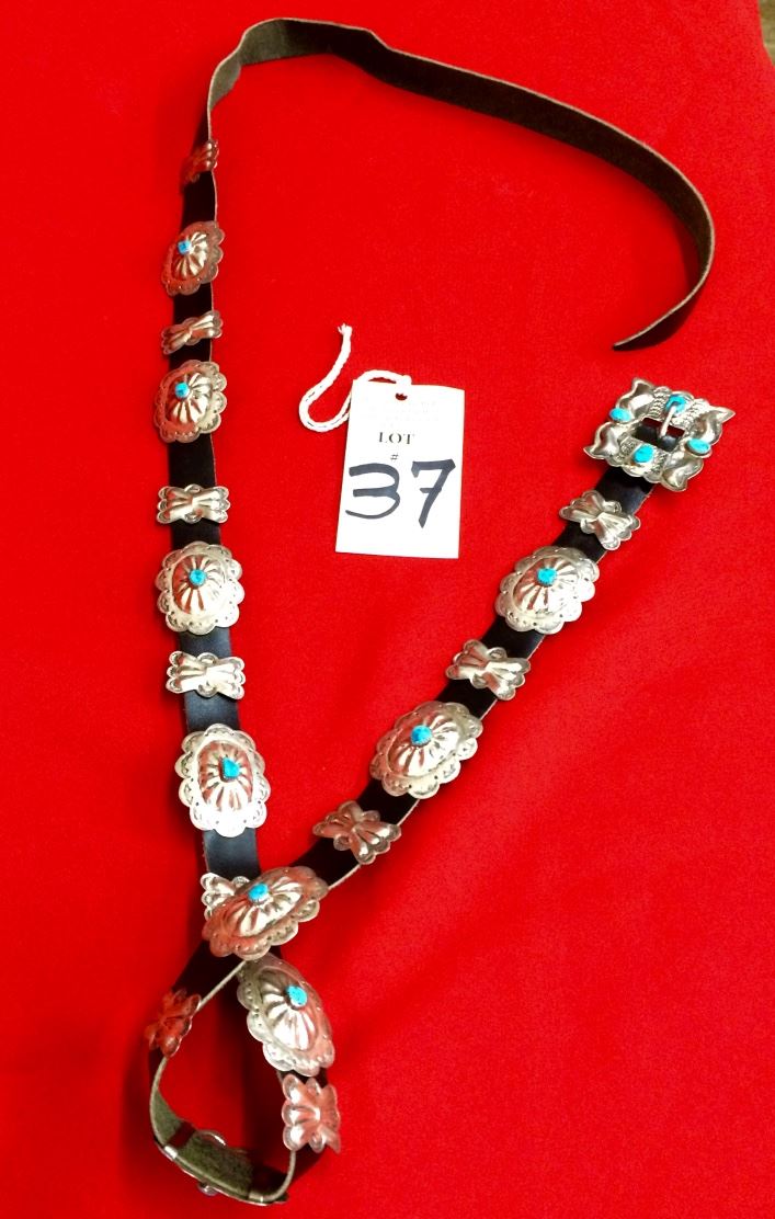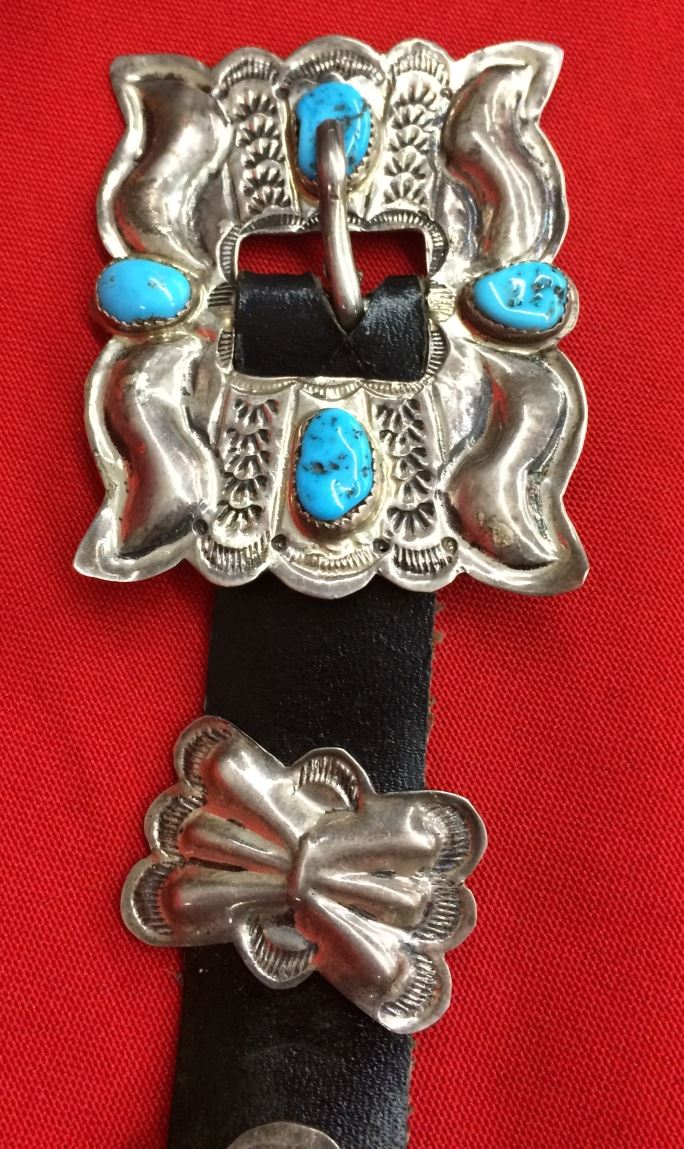 This vintage Navajo concho belt is basically “new old stock” from an old trader’s inventory. Probably made during the 1960s or ‘70s, this has never been worn and the leather can be cut to your custom length. As it is now, the leather belt is 60” long and has no hole punched in it. Marked BY for Ben Yazzie. In “like new” condition.
