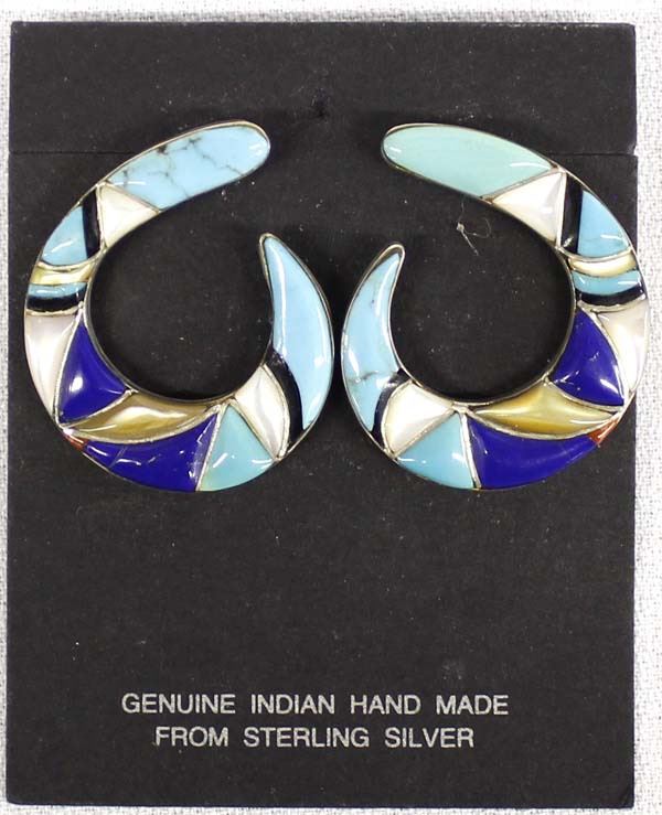 Elegant Native American Navajo Stone & Shell Overlay on Sterling Earrings, measure 1'' x 1.5'', includes turquoise, mother of pearl, jet, gold lip shell, and lapis, both are stamped sterling
