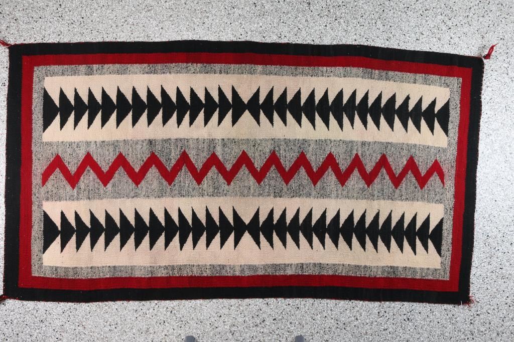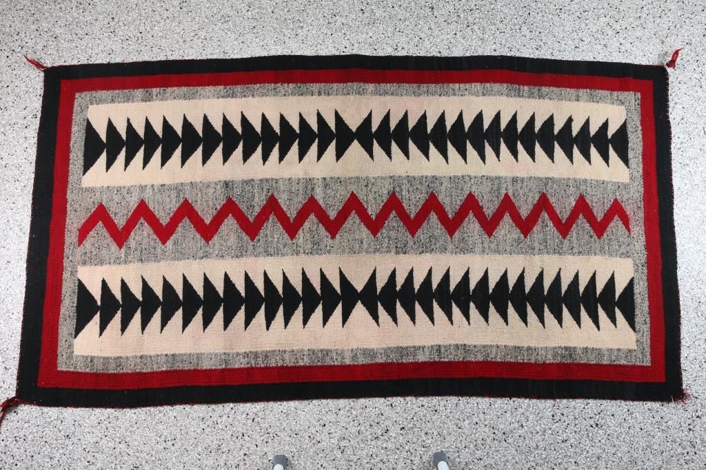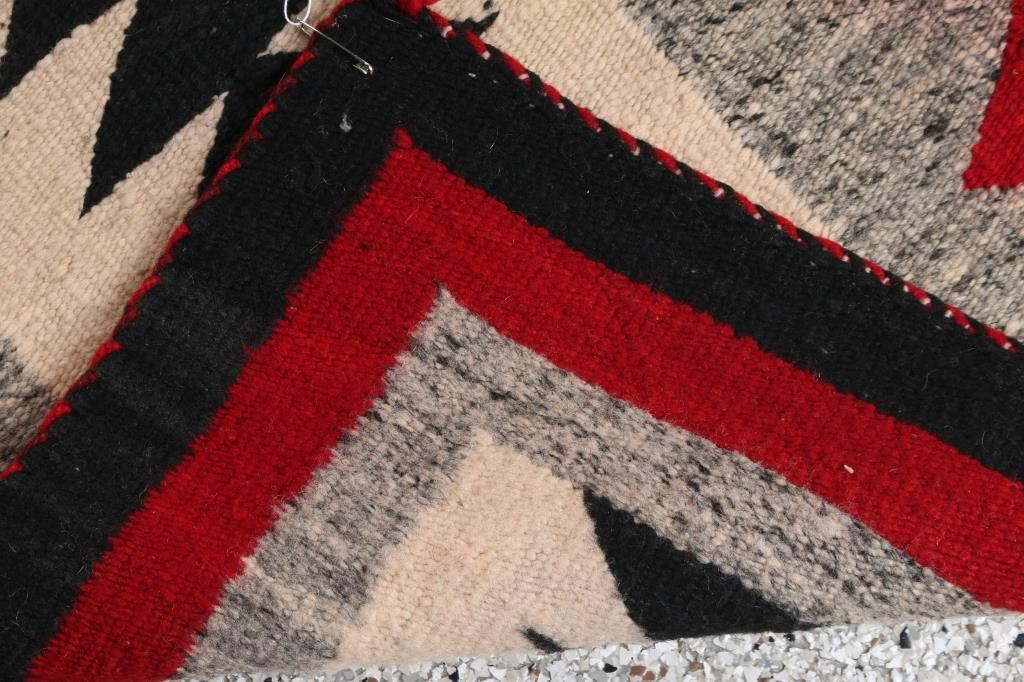 With arrowheads, traditional red, black, white and grey. Measures 71" x 38". Condition is good overall, minor bleeding.