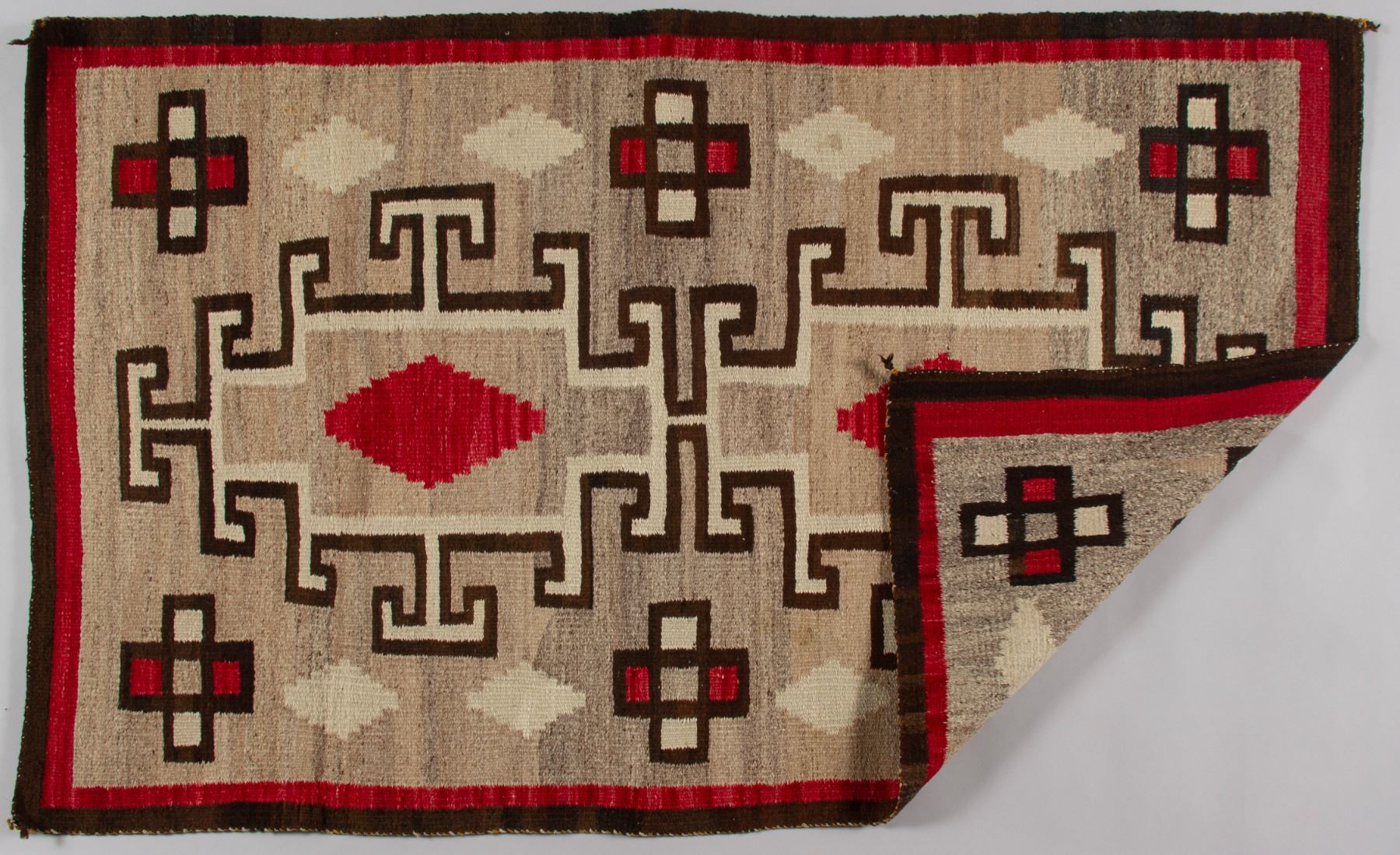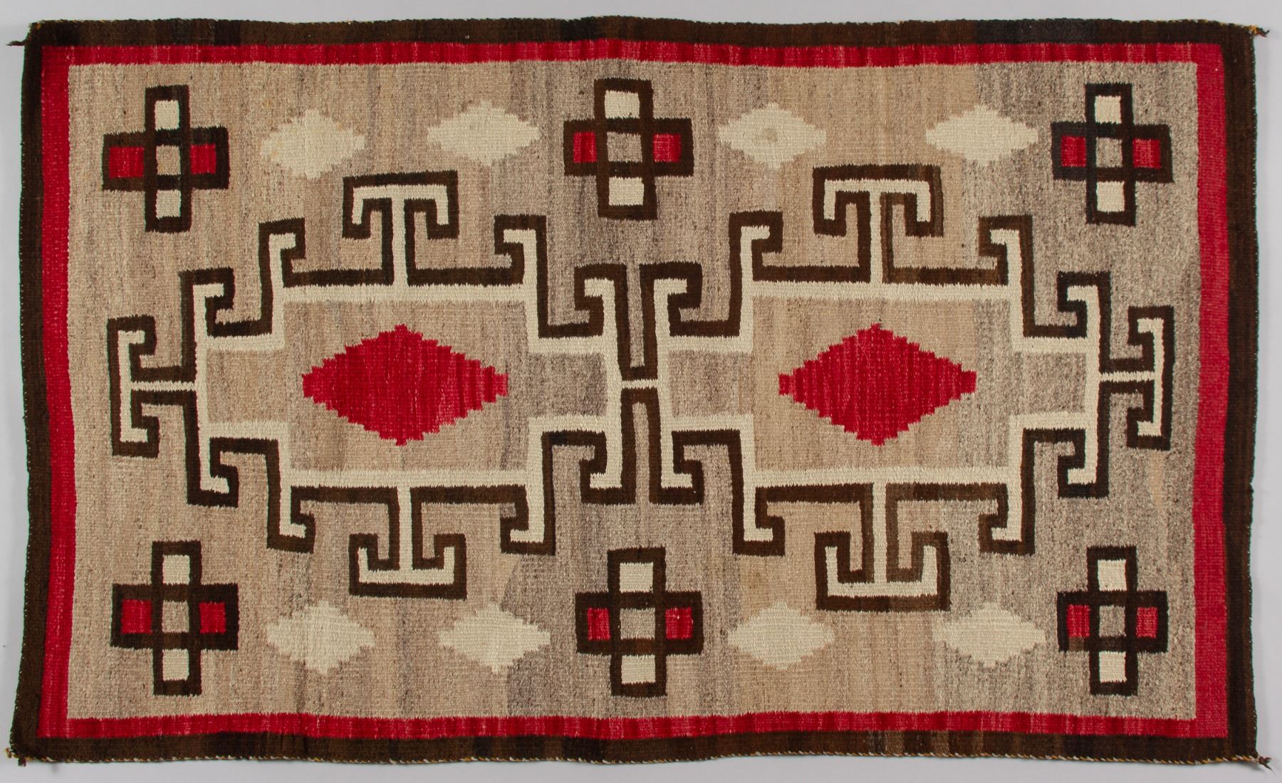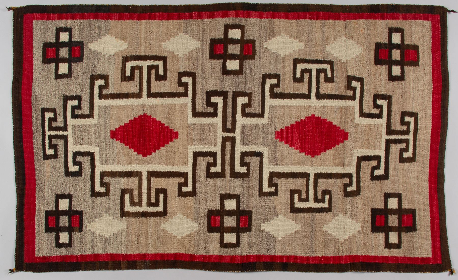 A striking, finely woven vintage Navajo textile, executed in the classic and highly collectible Storm Pattern design. This piece showcases traditional, likely hand-spun, wool in naturalistic shades of undyed grey, tan, and cream, accented with rich dark brown borders and two vivid, possibly aniline-dyed, red diamond motifs. The design is iconic of weavings from the Crystal Trading Post region, featuring a central rectangular motif connected by dynamic lightning-like zig-zag lines to smaller square elements in the four corners, representing the four sacred mountains. The corners also incorporate distinct cross motifs, characteristic of the Ganado style.