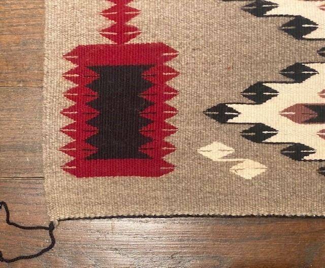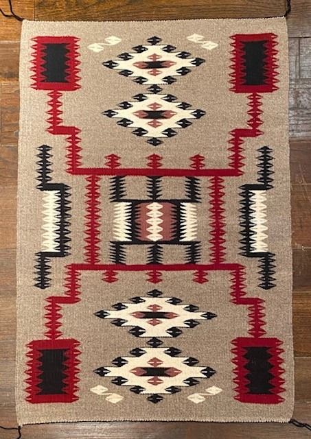 This is a very unique Storm Pattern woven by Ruby Begay. Measures 38-inches by 25.5-inches. Looking for a Navajo Rug as a Statement Piece on the Wall or Floor, you might consider this one.