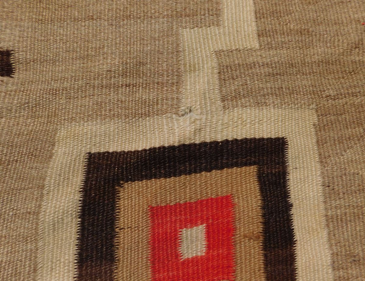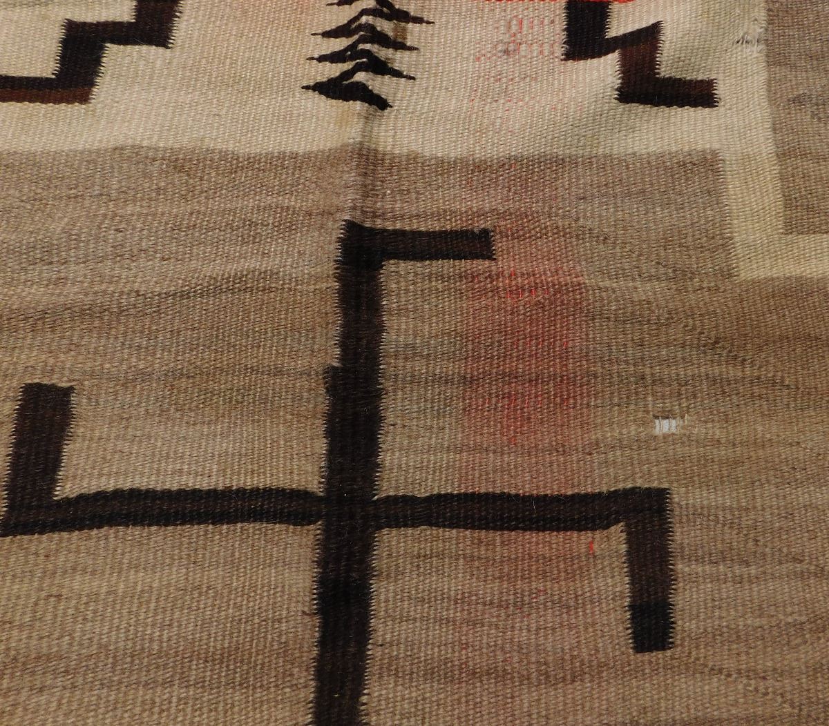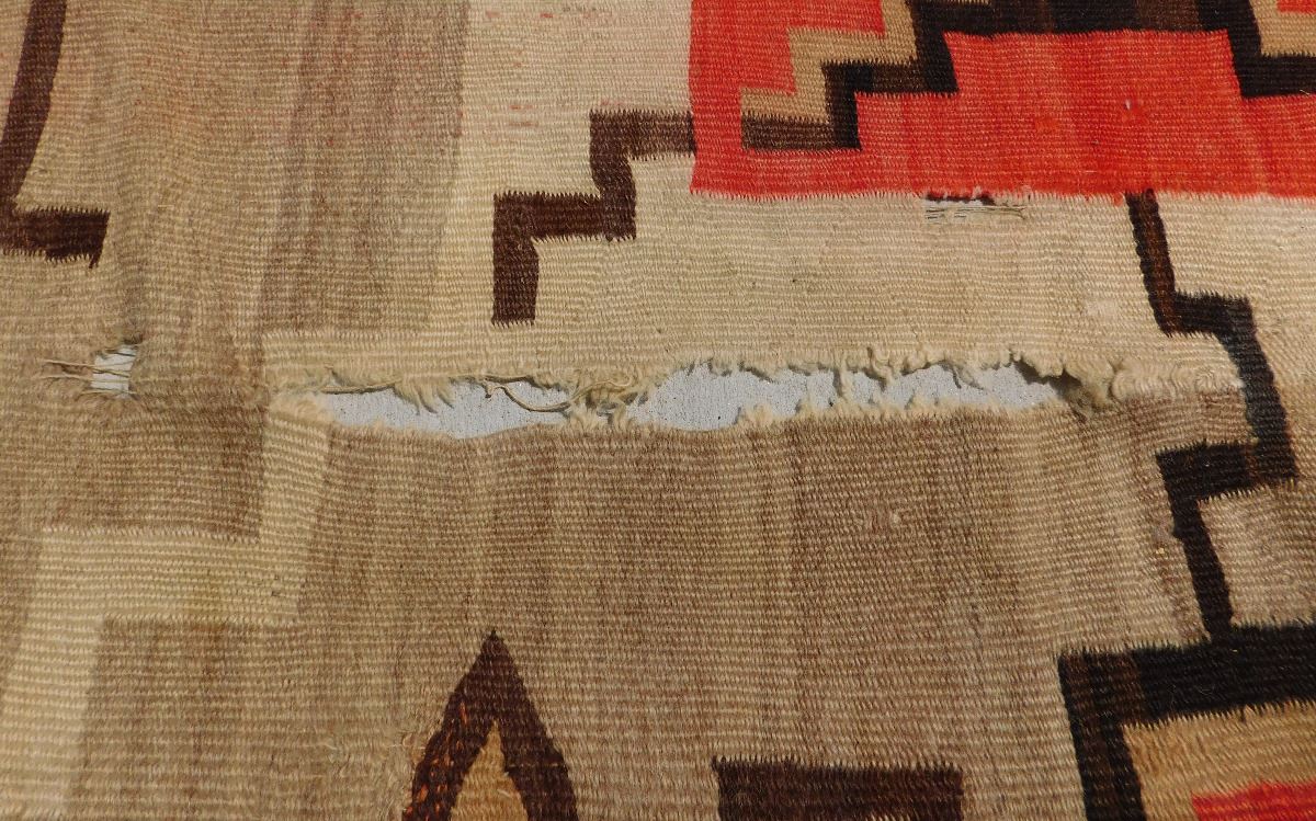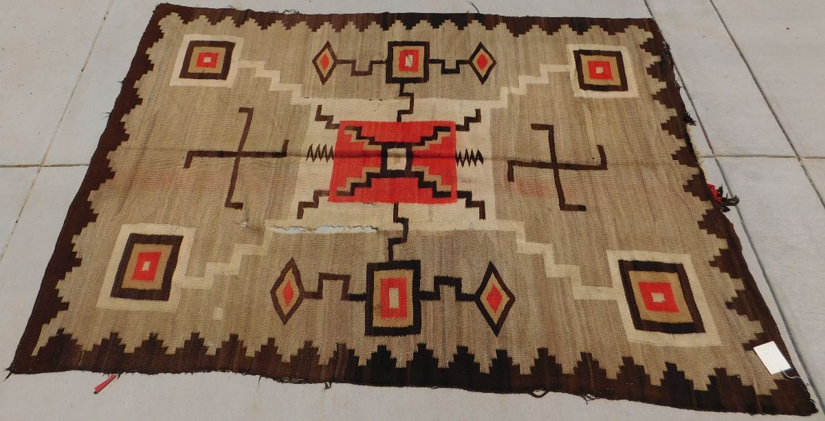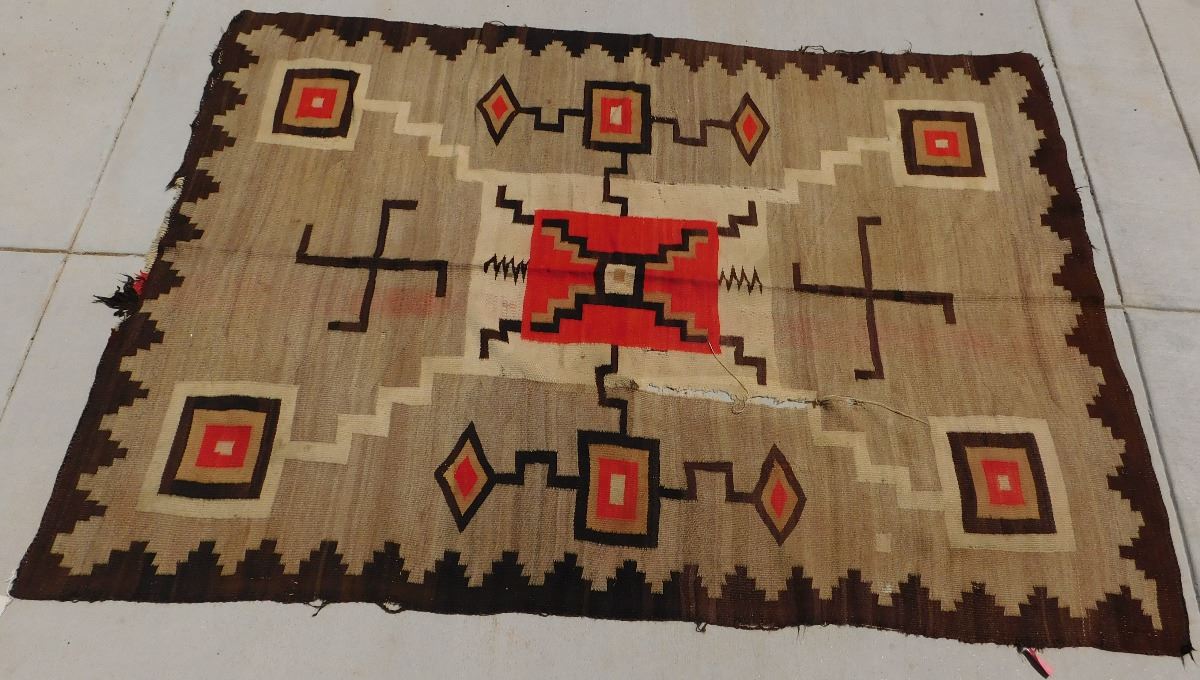 Navajo Storm Weaving, circa 1920s. Made of wool, this item 87" x 61". Navajo, New Mexico. Whirling logs design. Condition: Has stains, serious tear in middle, see images. Shipping: $45.00.