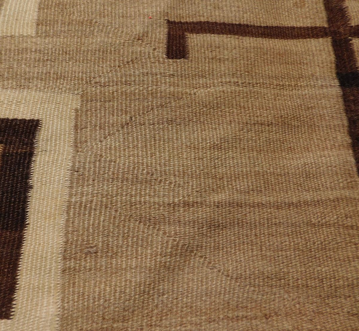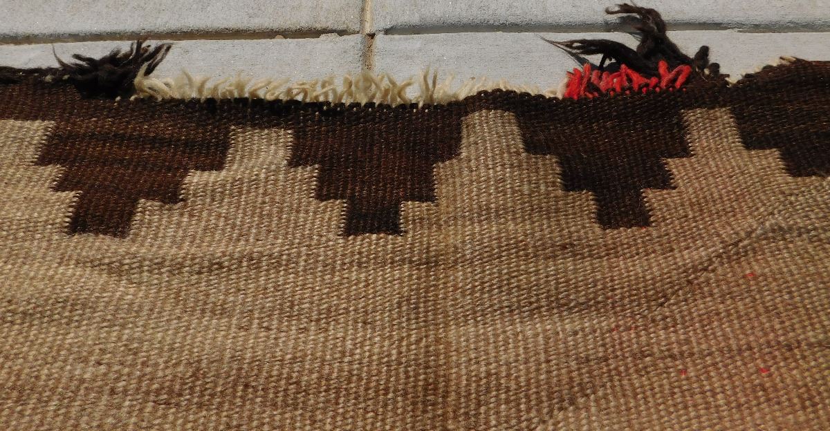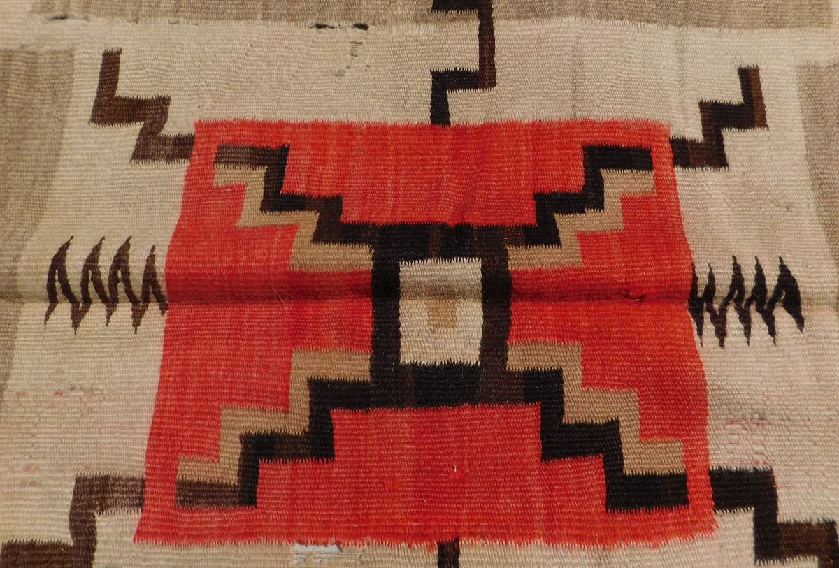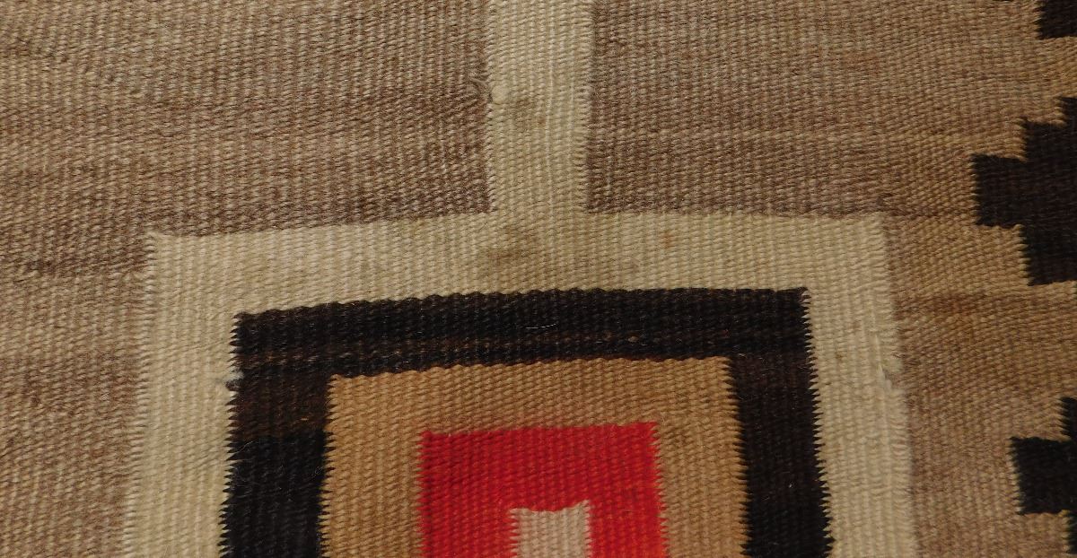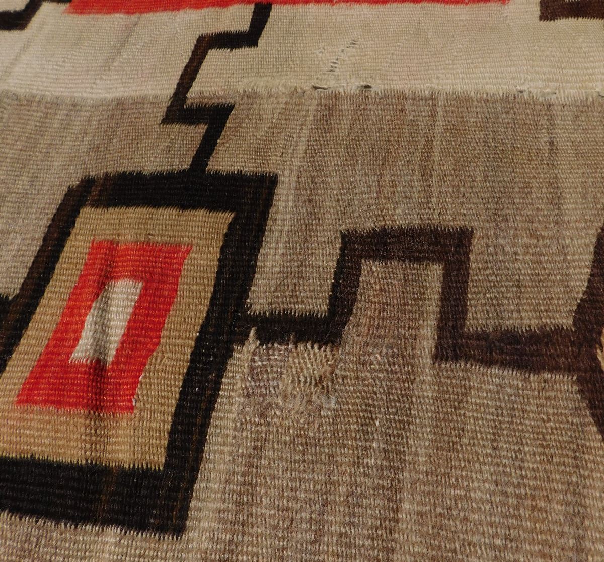 Navajo Storm Weaving, circa 1920s. Made of wool, this item 87" x 61". Navajo, New Mexico. Whirling logs design. Condition: Has stains, serious tear in middle, see images. Shipping: $45.00.