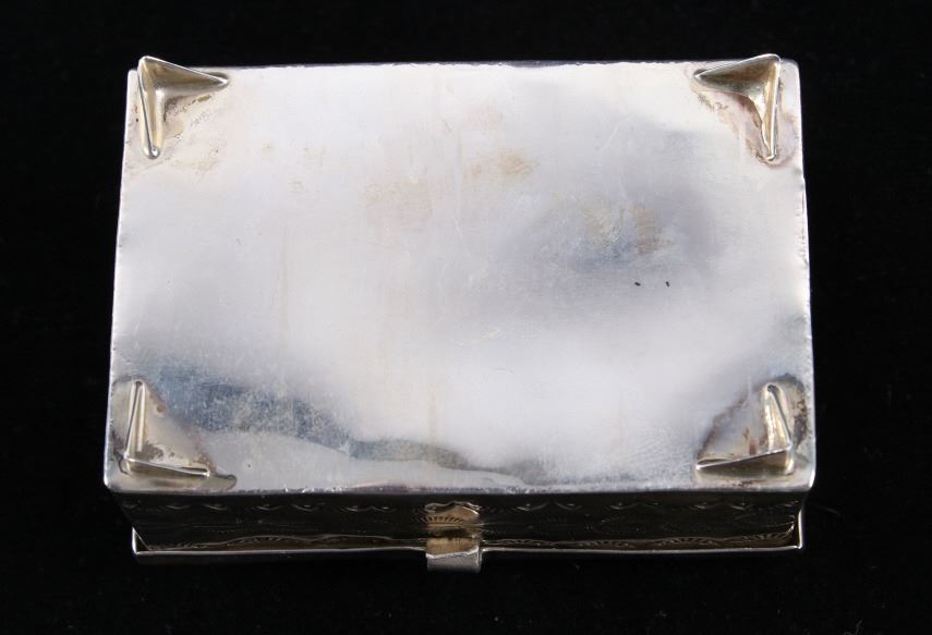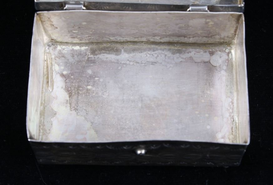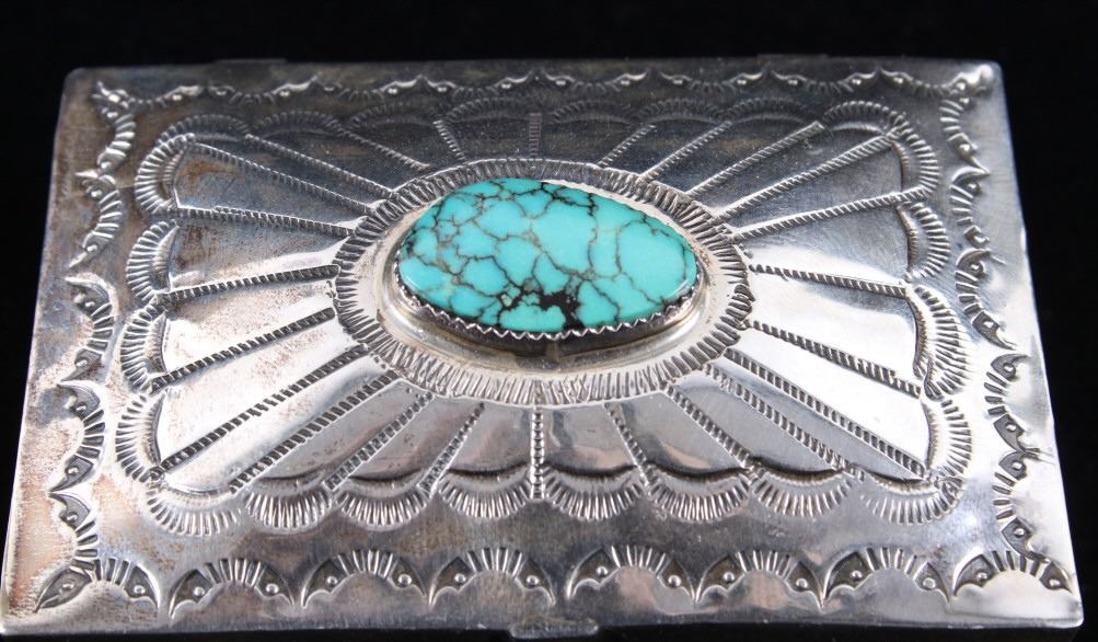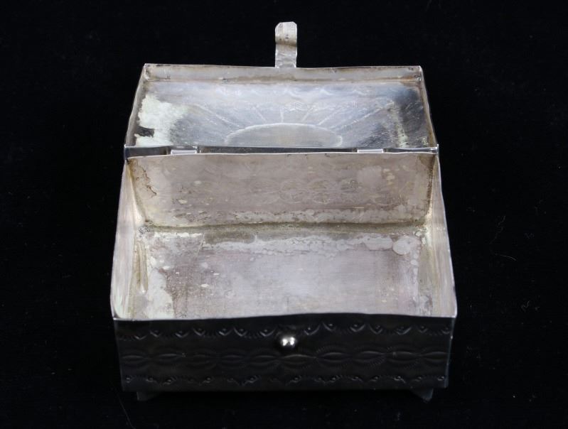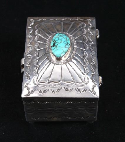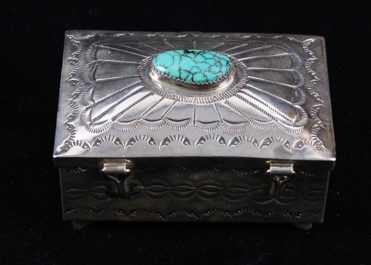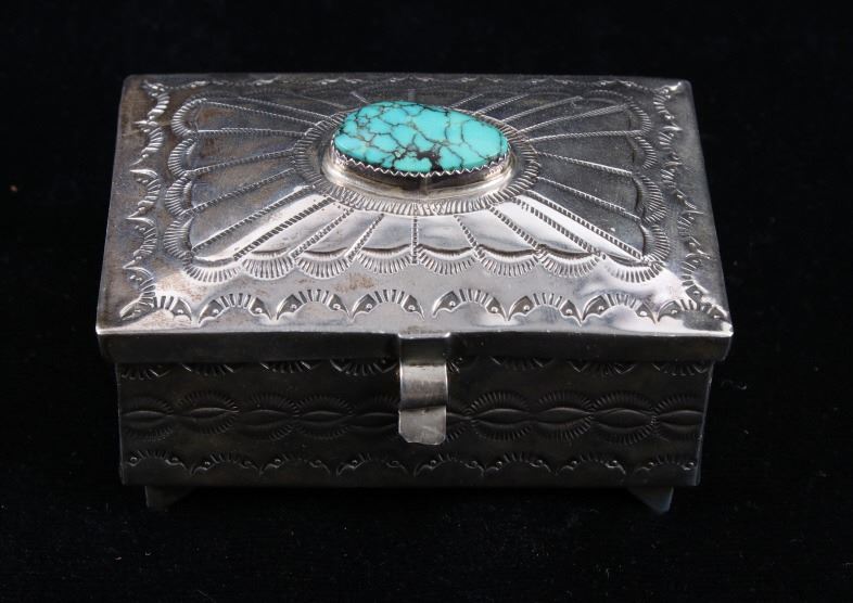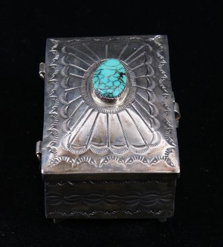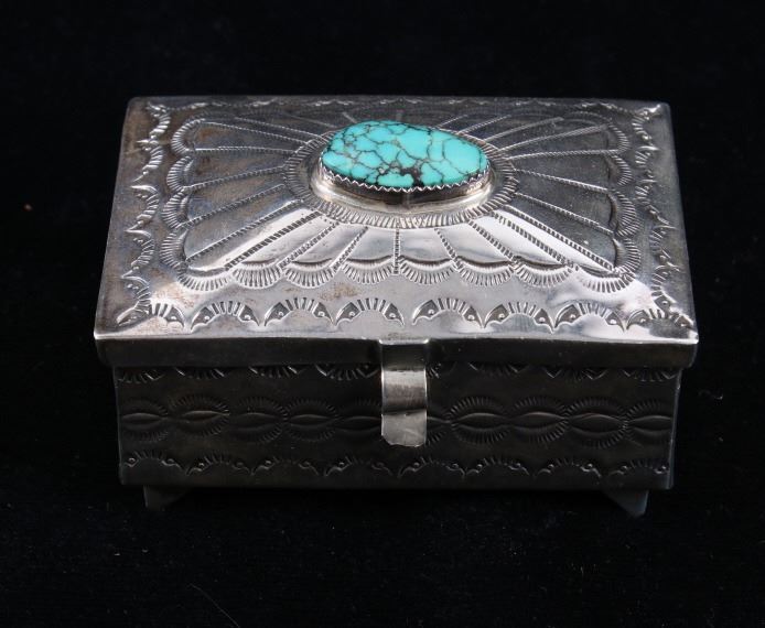 For your consideration is a fantastic, Navajo Native American, sterling silver and Stormy Mountain turquoise box. This box has an amazing finish and styling that resembles the Navajo stamp work of the early 1900’s. On the top is a nice size, polished cabochon of Stormy Mountain turquoise, showing a blue-green coloring with black host matrix, bezel set into the silver. The top of the box has a nice, curved finish with heavy stamping and is hinged, revealing a patina’d silver inside. The outside of the box has a similar, heavy stamped finish to match the extended lid and is finished by four triangular feet. The piece has a heavy construction for its size and is crafted of sterling silver. The box measures overall 3” x 2” x 1 ¾” when the lid is closed.