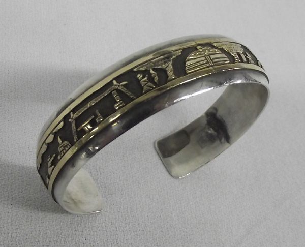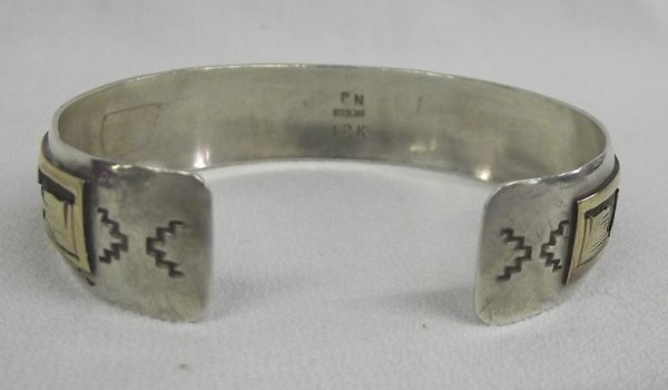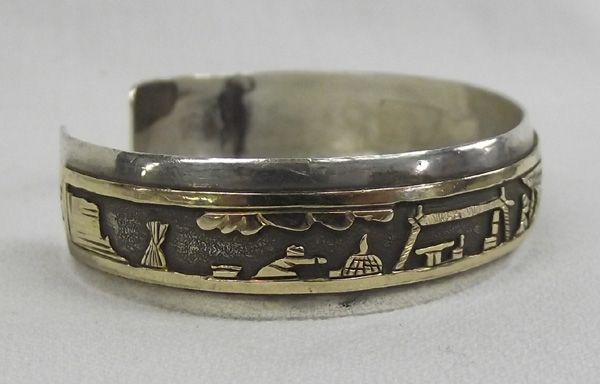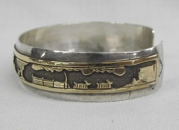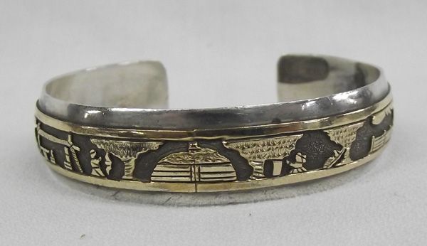 Navajo Storyteller Bracelet, Sterling & Gold Overlay. Handsome storybook bracelet, sterling silver with 12k gold overlay. Measures 7 3/4'' x 5/8'' wide. Marked ''PN'', ''sterling'' ''12K''.