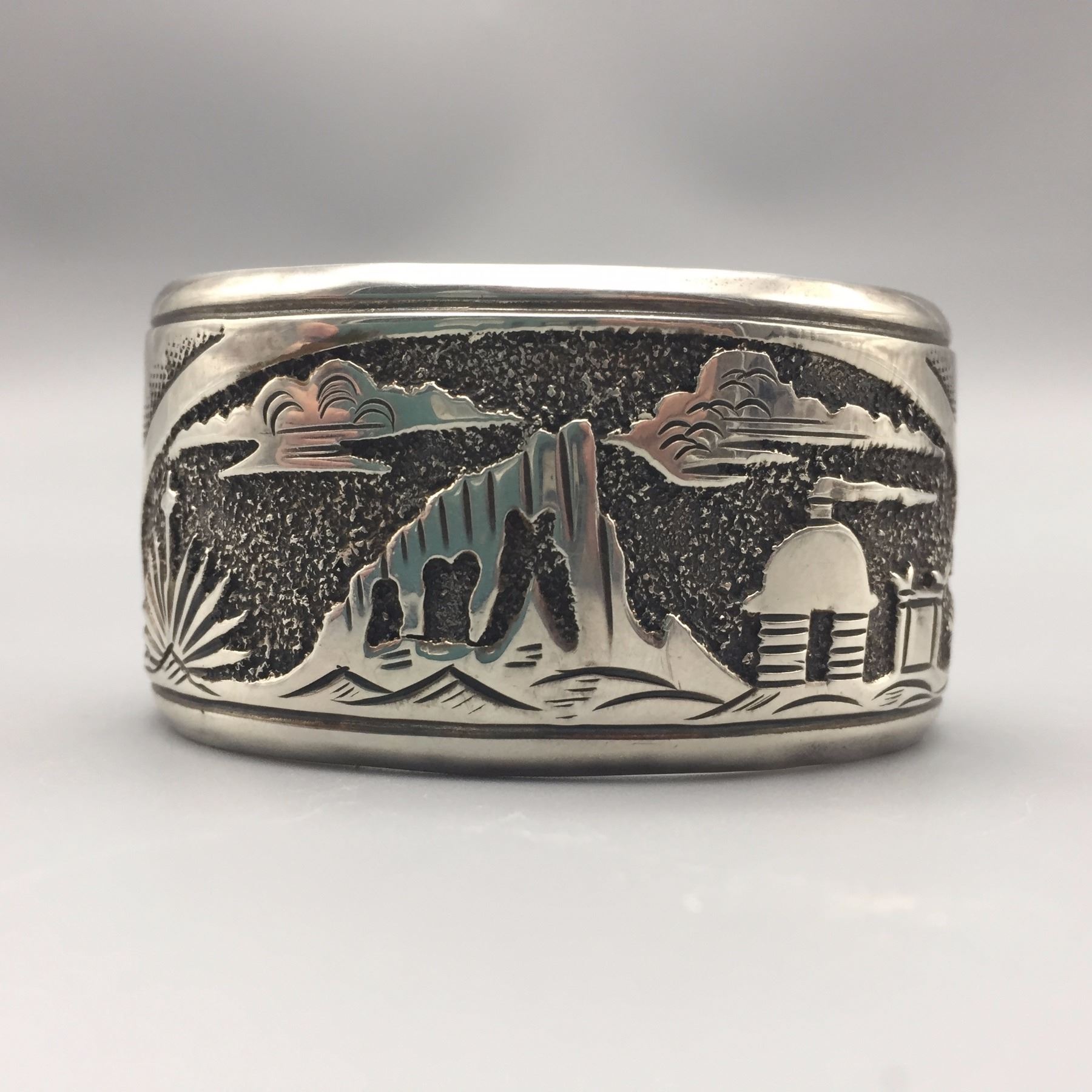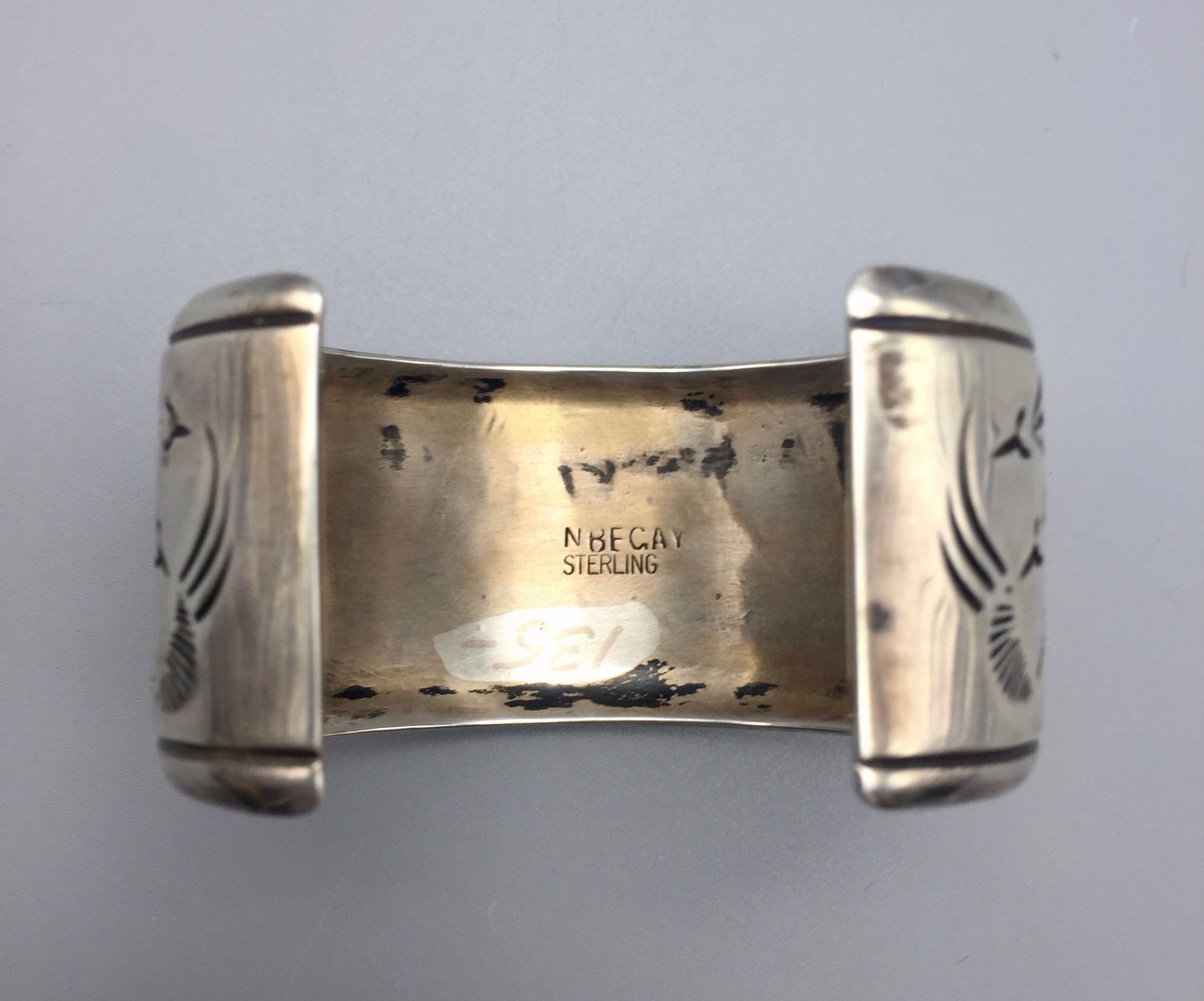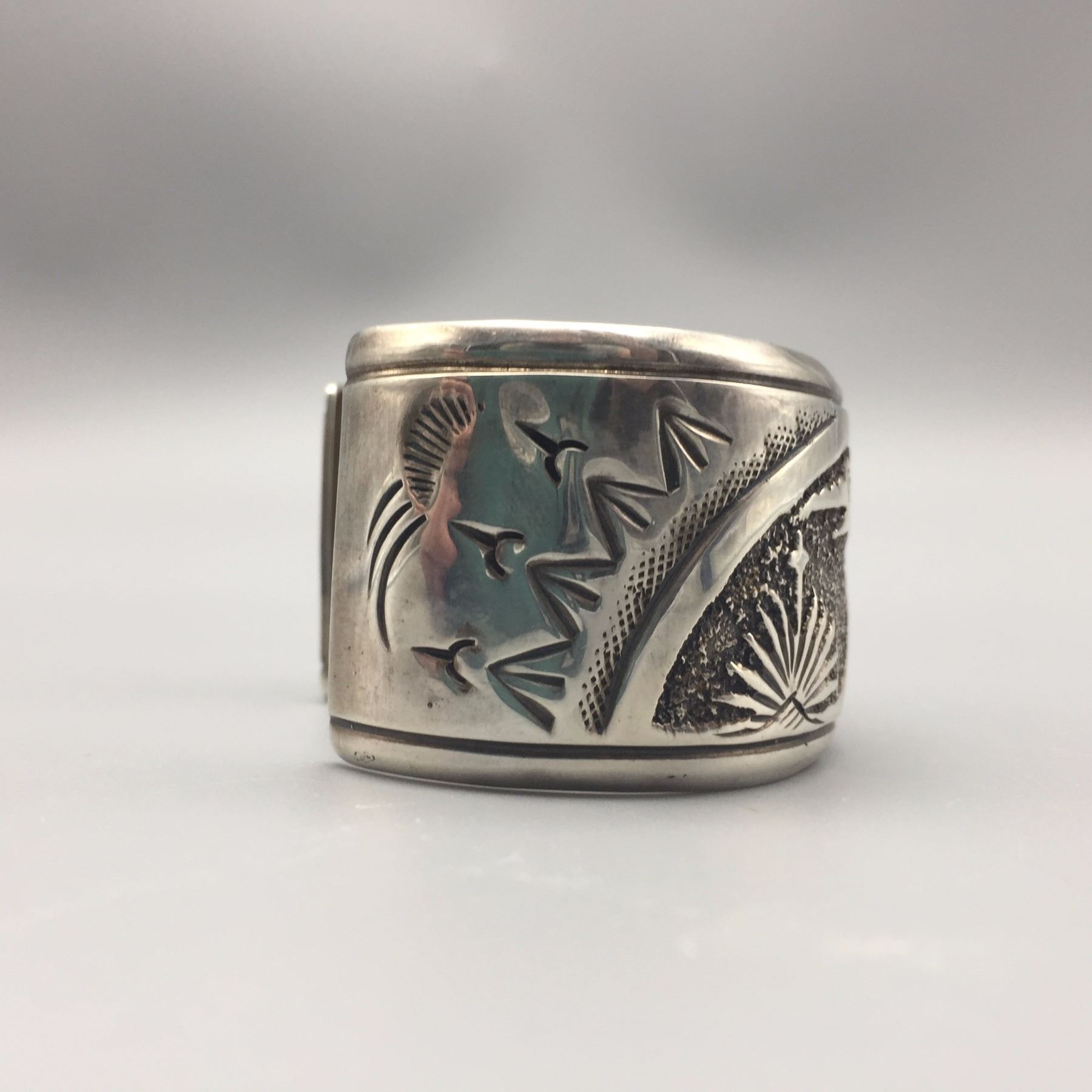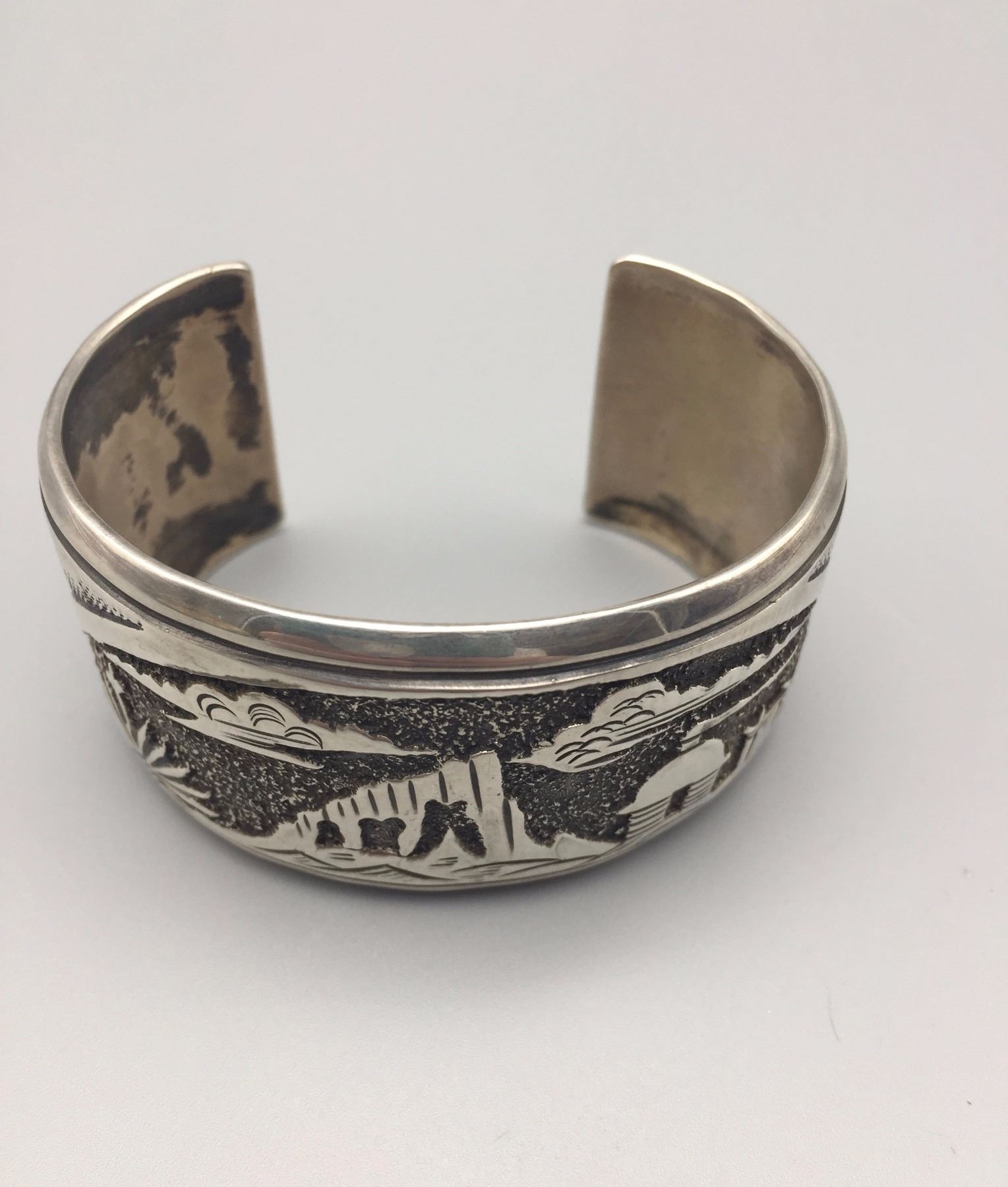 Maker: Signed, N. Begay. Approx. Age: Circa 1980s. Size: Inside circumference measures 5 1/2” with an additional 1 1/4” opening (making it fit an approx. 6 3/4” wrist), 1 1/4” w and weighs 53.3 g. Additional Info: Navajo storyteller bracelet. Condition: Good, normal wear expected. Please look closely at the pictures - they are an important part of our description. Shipping: There will be a $5 handling / packaging fee for shipping this lot. The actual cost of postage will be added on top of that.