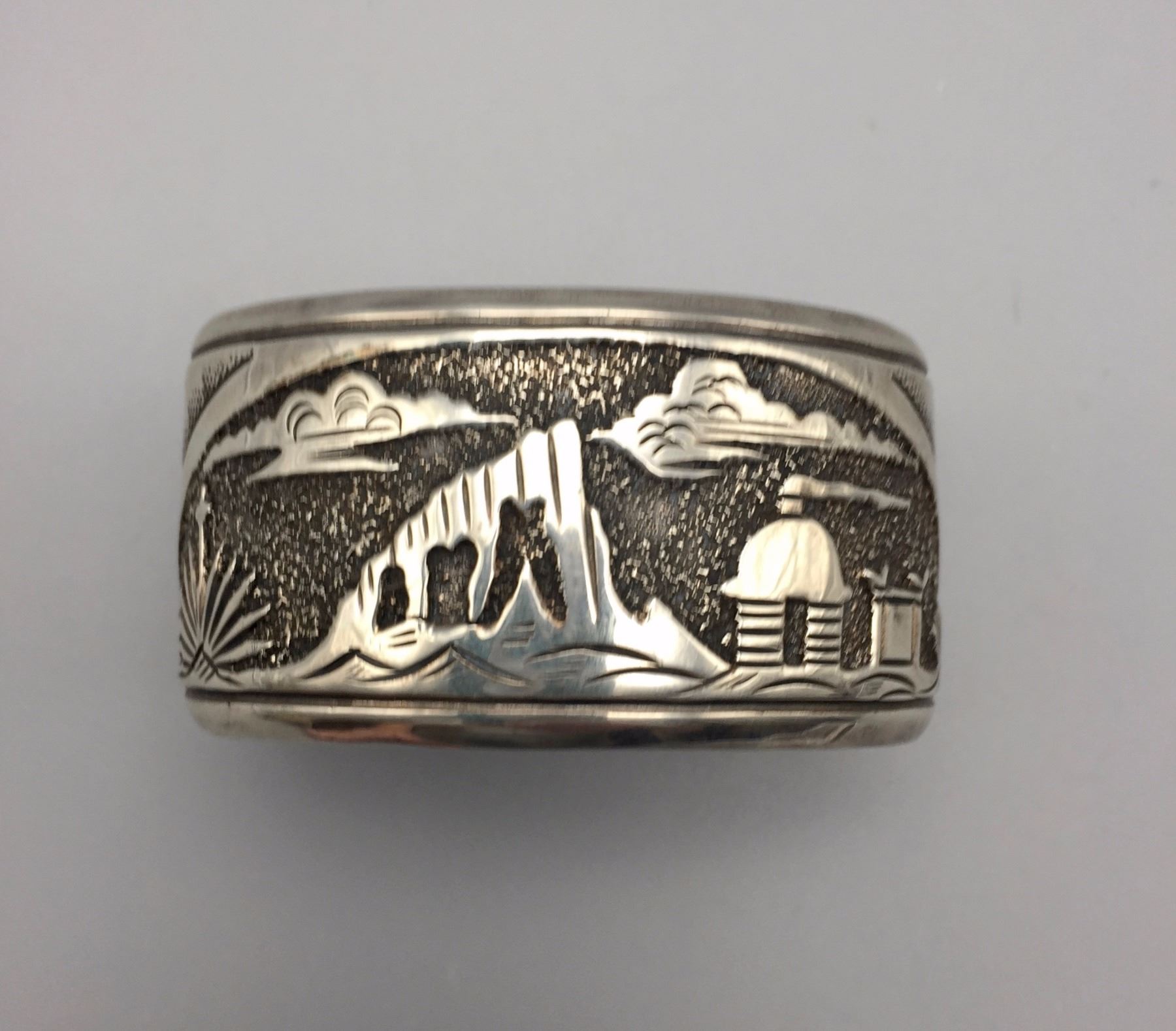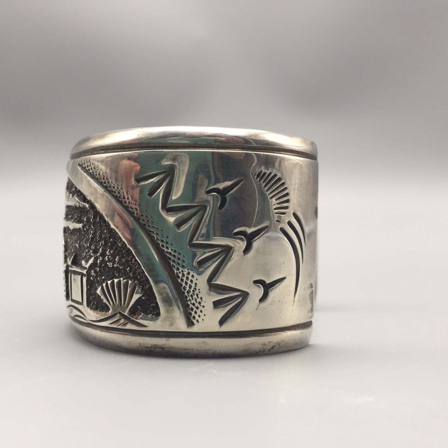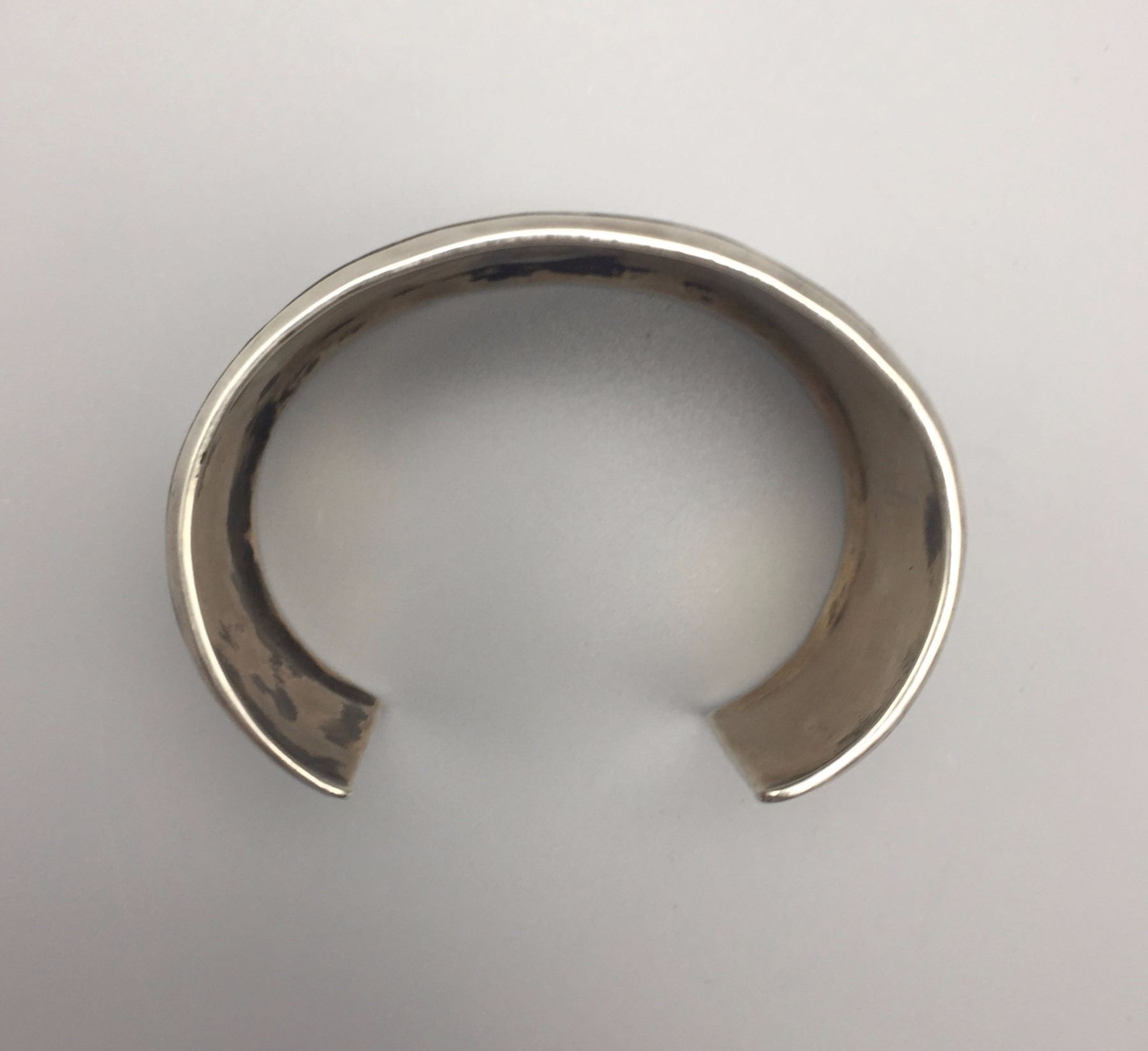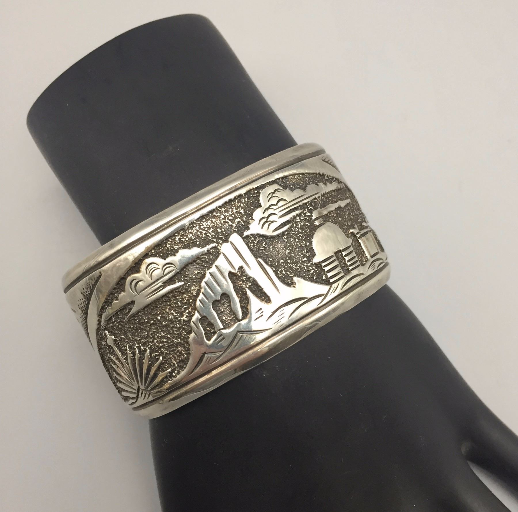 Maker: Signed, N. Begay. Approx. Age: Circa 1980s. Size: Inside circumference measures 5 1/2” with an additional 1 1/4” opening (making it fit an approx. 6 3/4” wrist), 1 1/4” w and weighs 53.3 g. Additional Info: Navajo storyteller bracelet. Condition: Good, normal wear expected. Please look closely at the pictures - they are an important part of our description. Shipping: There will be a $5 handling / packaging fee for shipping this lot. The actual cost of postage will be added on top of that.