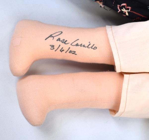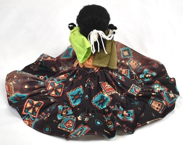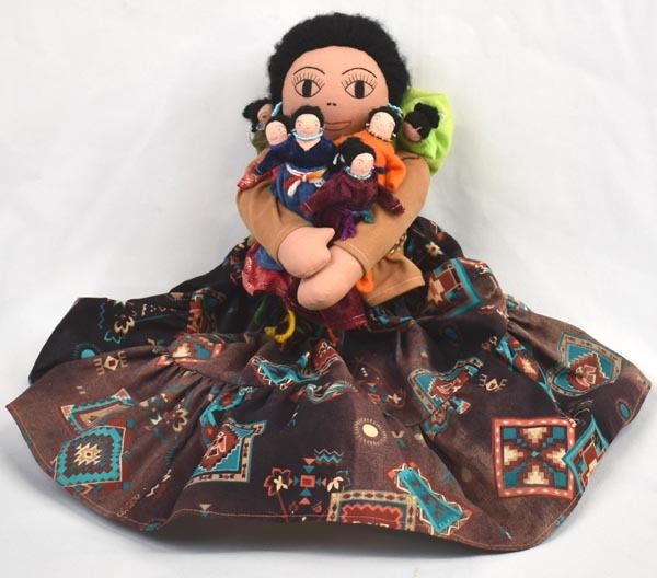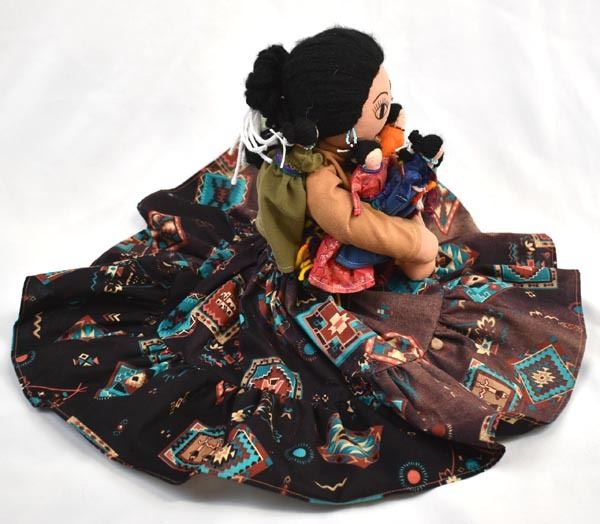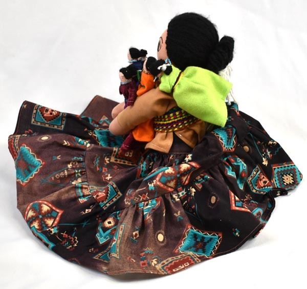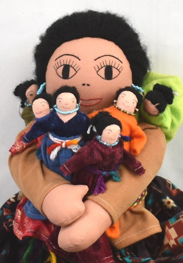 2002 Navajo Storyteller Cloth Doll by Rose Carrillo, measures 6'' x 18'', well executed, wearing traditional clothing, dolls are all wearing beaded necklaces and earrings, the mother has a hand stitched face, the children have drawn on faces, lots of beautiful colors, all dolls have yarn hair, doll is signed by the artist on doll's right leg