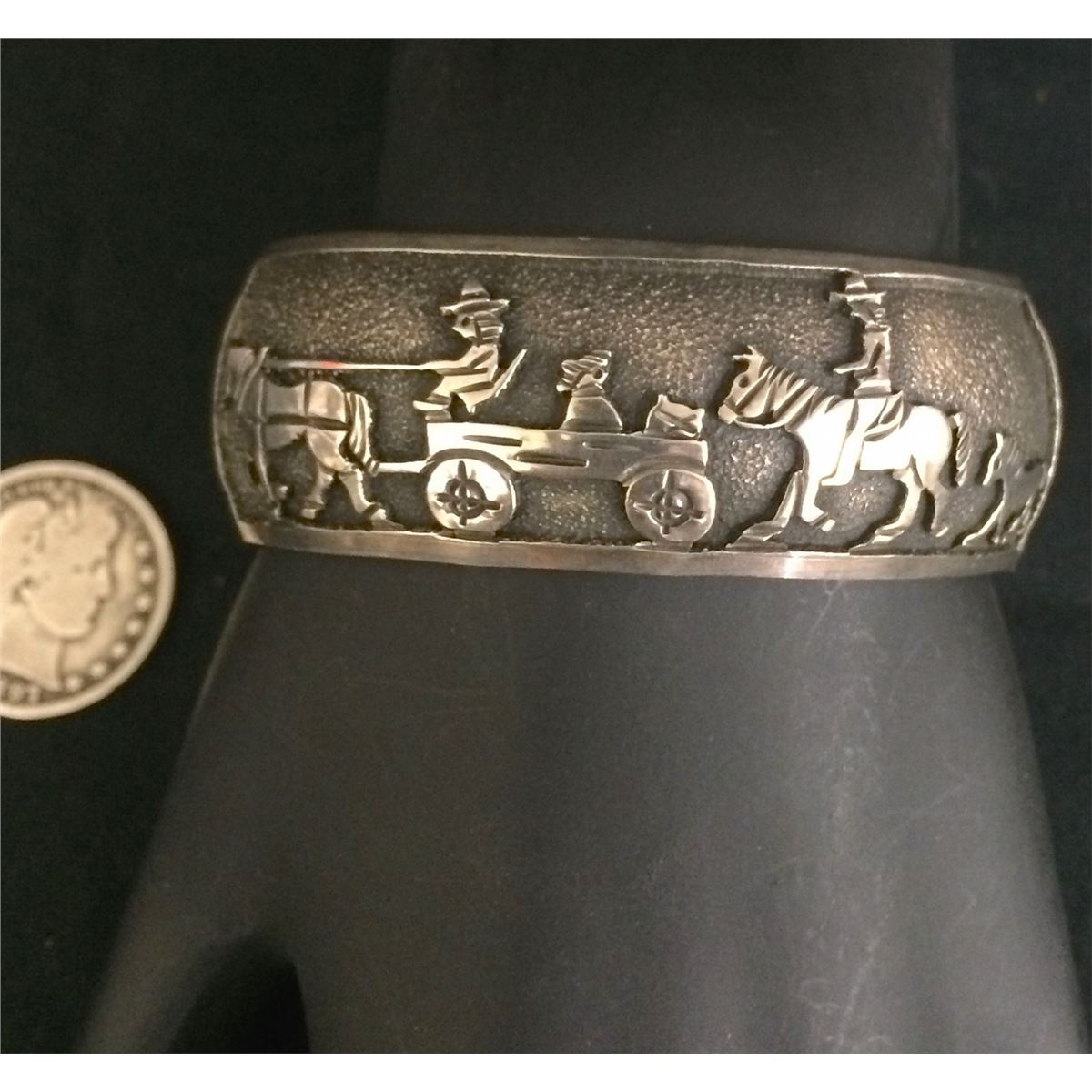 This Storyteller cuff bracelet is stamped H Y and Sterling. It measures approx. 5 3/4" inside circumference plus there is a 1 3/8" opening. It is just under 1" wide and weighs approx. 41.8g.