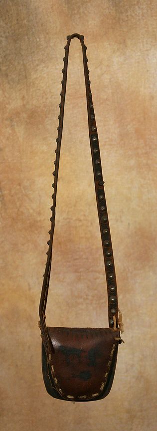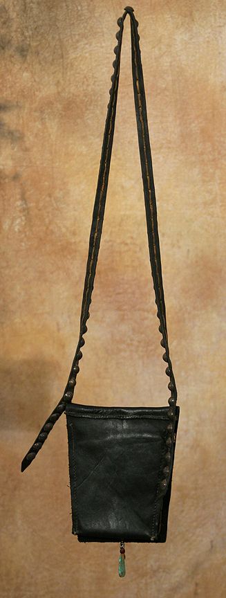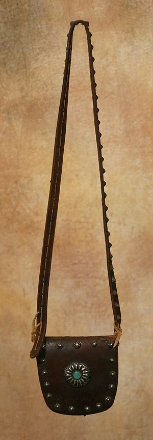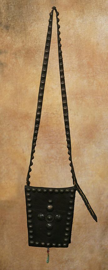 Navajo Studded Carrying Bags. Both with turquoise embellishments. 1. 5 ½" x 5 ½" with a 21" strap. . 2. 8" x 6" with a 22" strap. Commercial leather. Both 20th century. (est. $900-1,200). Provenance: From Dr. Deupree collection.. CONDITION REPORTS: www.auctioninsantafe.com/docs/cr2012.pdf