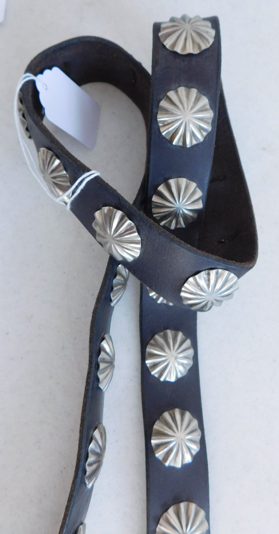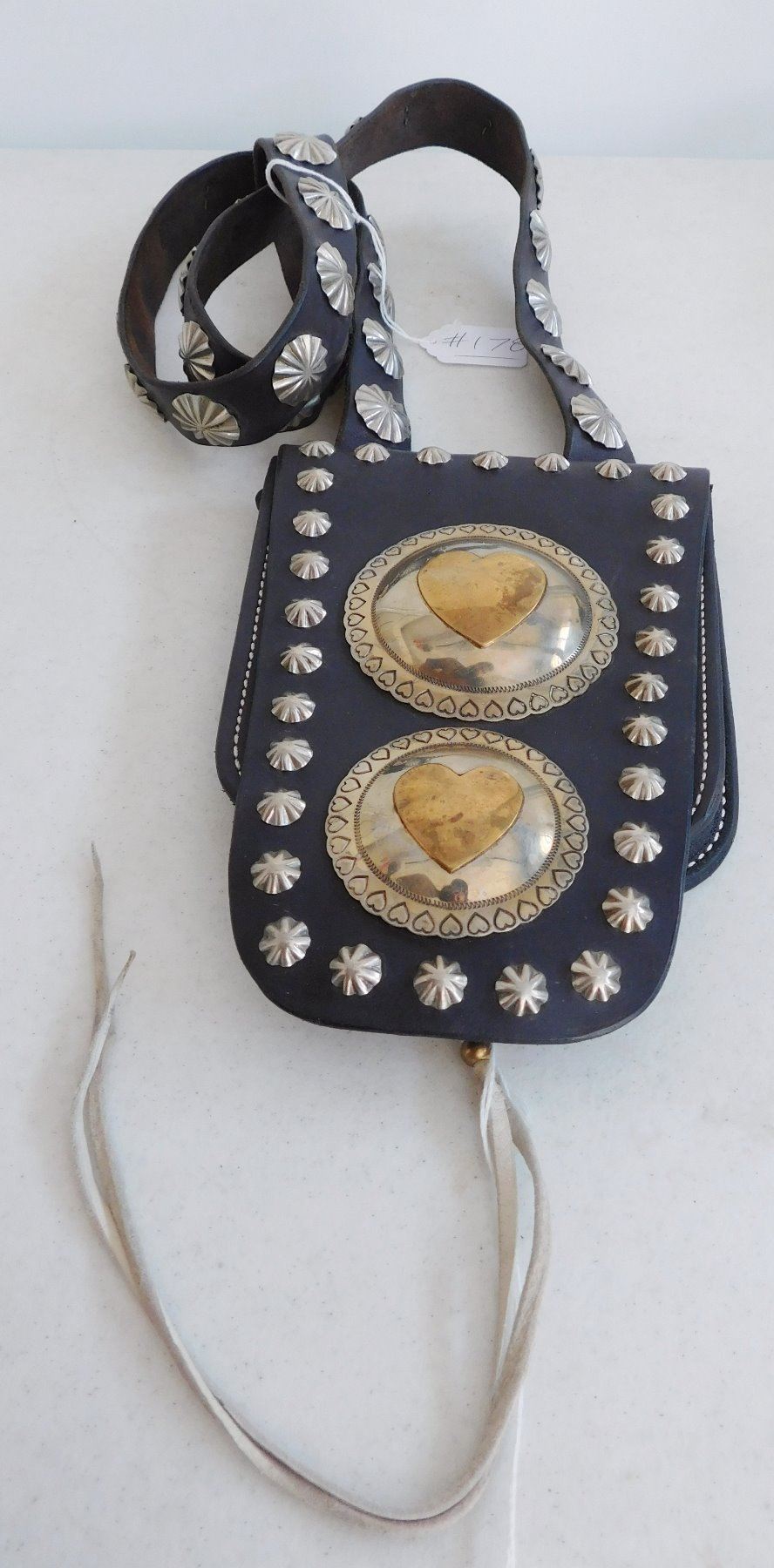 Navajo Studded Purse, c. 1960s. Made of copper, leather, silver and brass, the item measures 33" x 6" x 1". Navajo, New Mexico. Maker: Silvertip, Glorietta, N.M. Tested for silver alloy, definitely not sterling. Condition: Good, see images. Shipping: $22.50 w/insurance and signature.