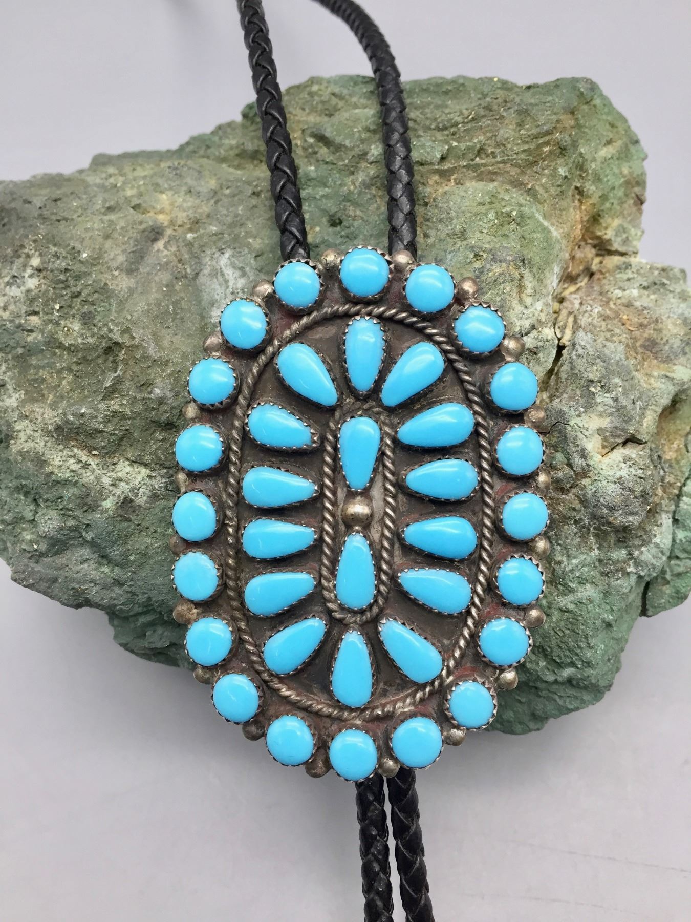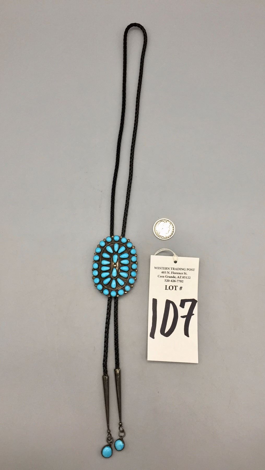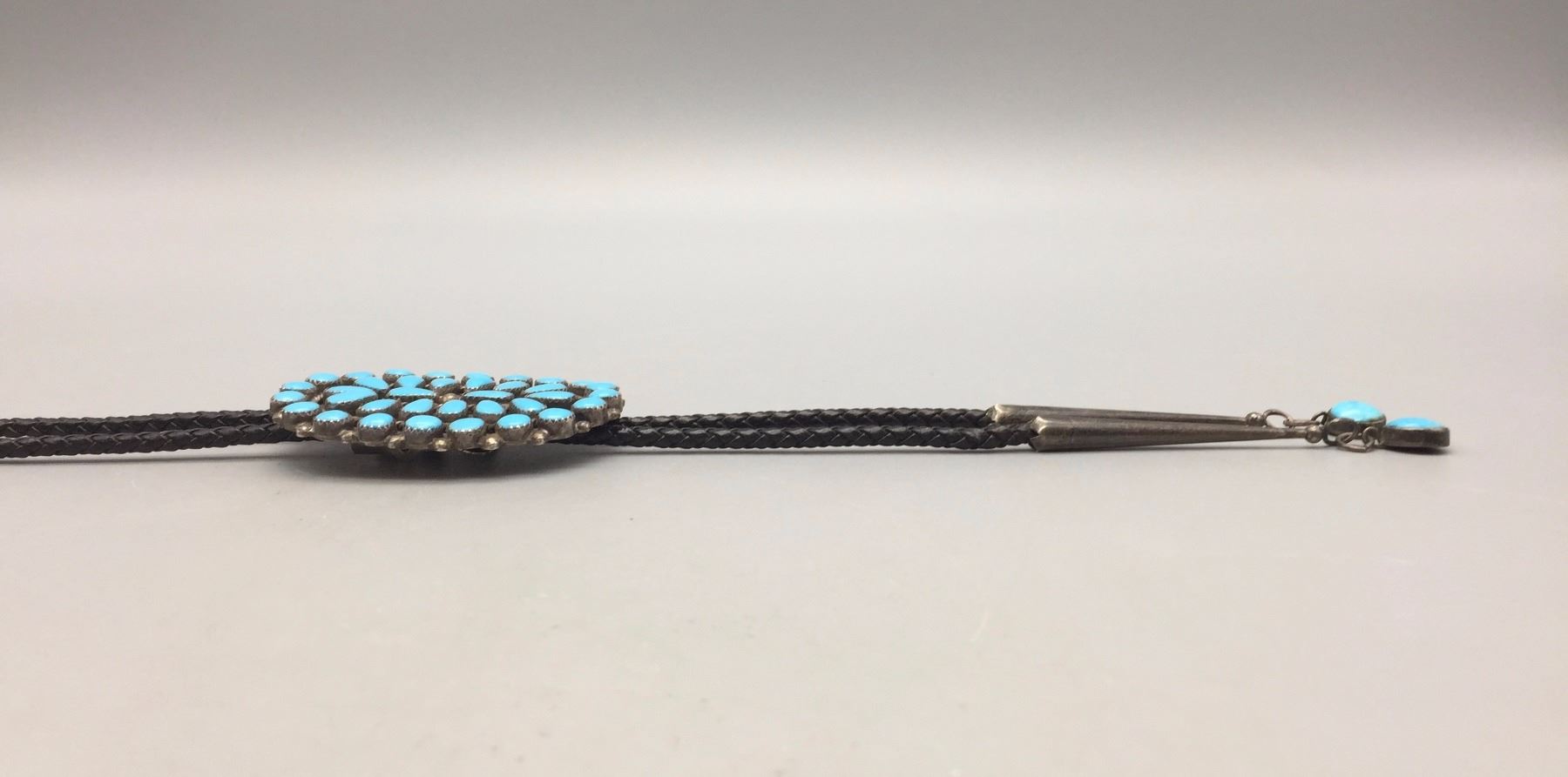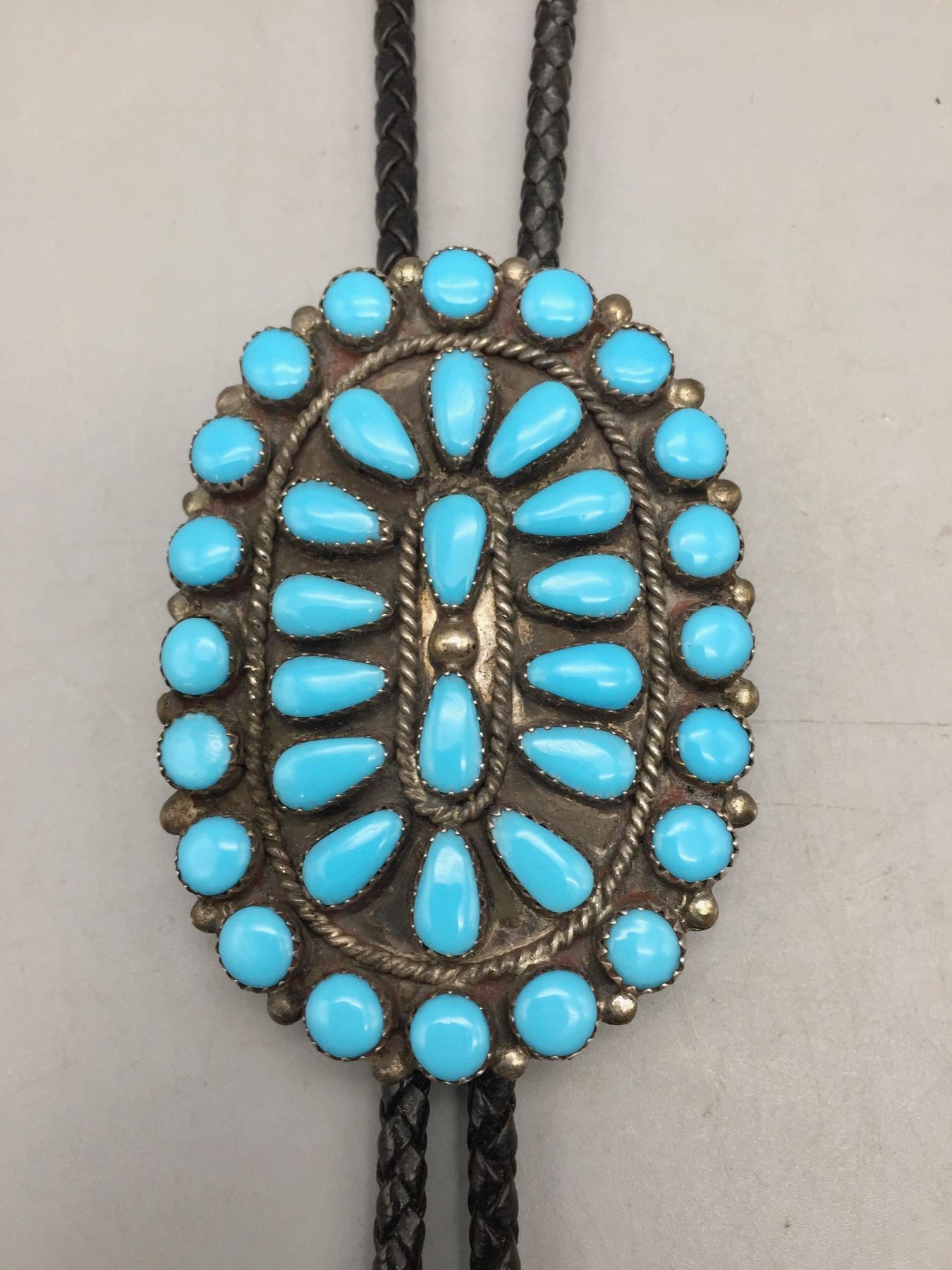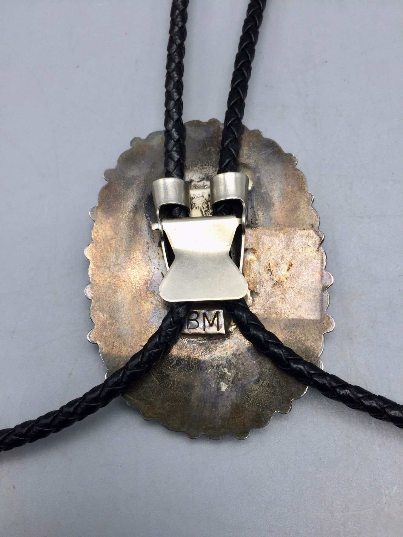 Description: Sterling silver, cluster style bolo slide with a black leather cord and sterling silver and turquoise, custom tips. Maker: Hallmarked, BM. Approx. Age: Vintage. Size: 38” around the neck and slide is 2 1/2” l x 2” w. Weighs 50.8 g. Condition: Good for its age, normal wear expected. Please look closely at the pictures - they are an important part of our description. Shipping: There will be a $5 handling / packaging fee for shipping this lot. The actual cost of postage will be added on top of that.