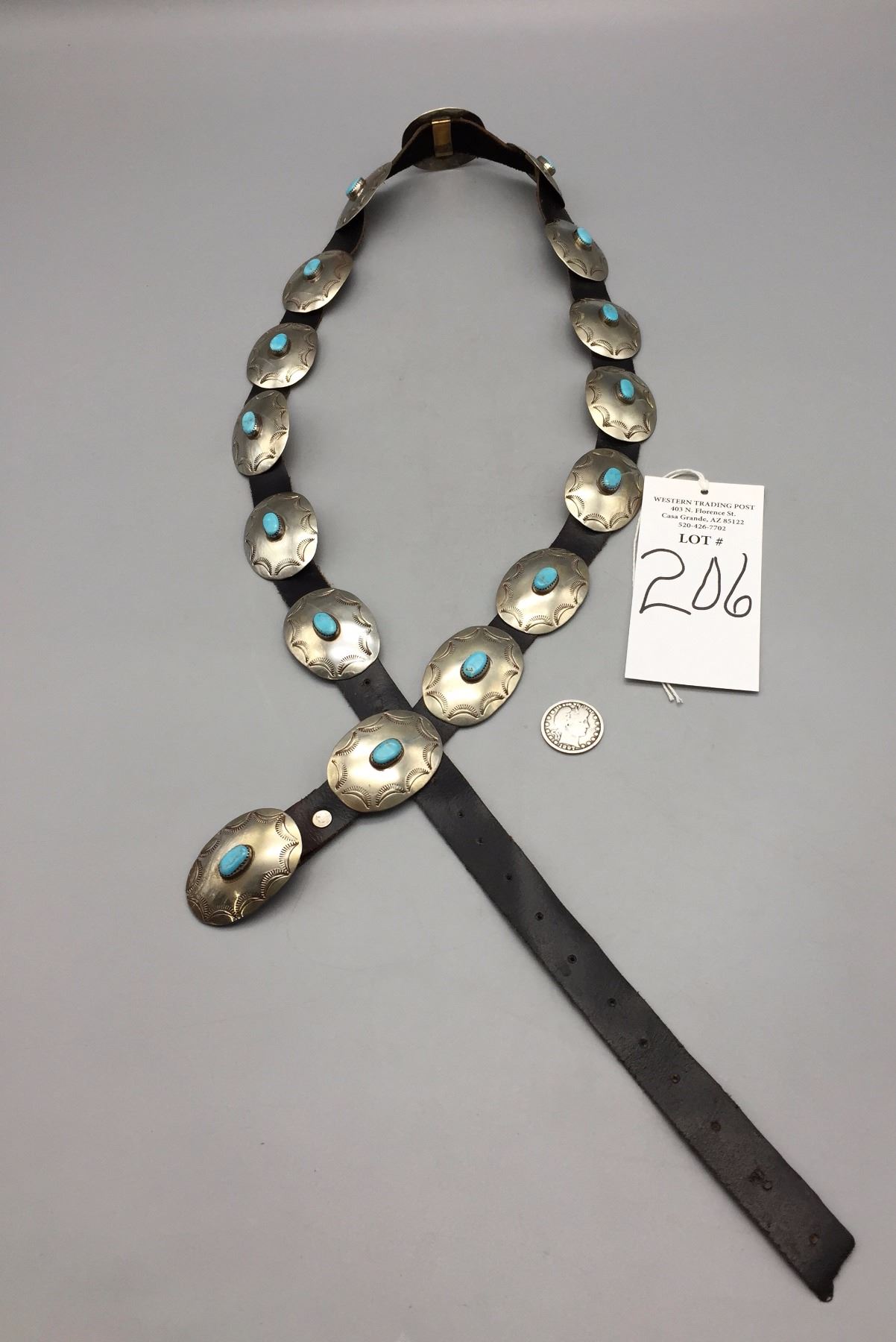 Description: A Navajo style concho belt with stamped detailing and a turquoise cabochon on each concho. Black leather belt. Unknown metal content. Maker: Unknown, no hallmarks. Approx. Age: Vintage. Size: Measures 46” end to end, conchos and buckle measure 1 3/4” l x 1 3/8” w. Weighs 140 g. Condition: Pretty good for its age, normal wear expected. Please look closely at the pictures - they are an important part of our description. Shipping: There will be a $5 handling / packaging fee for shipping this lot. The actual cost of postage will be added on top of that.