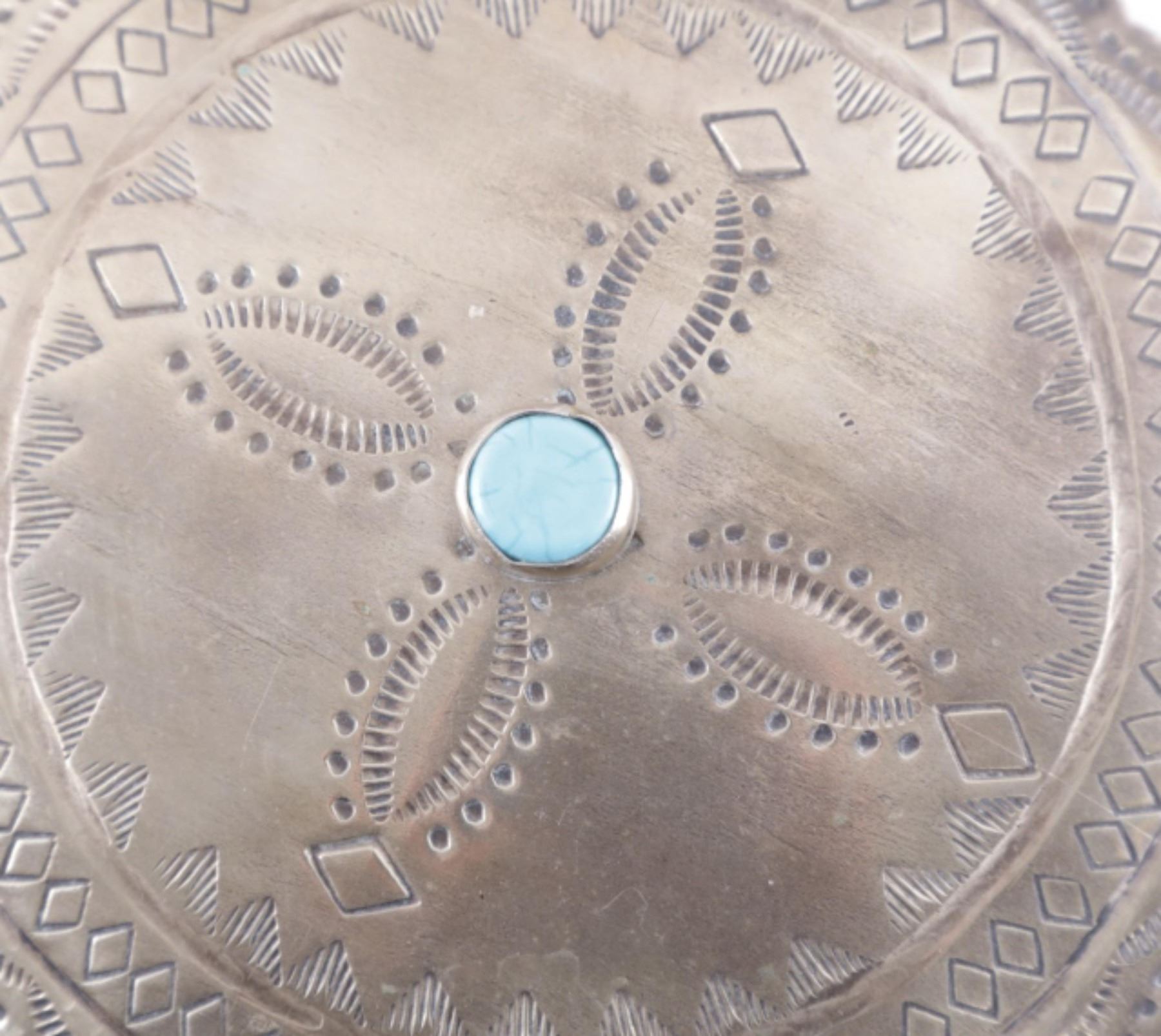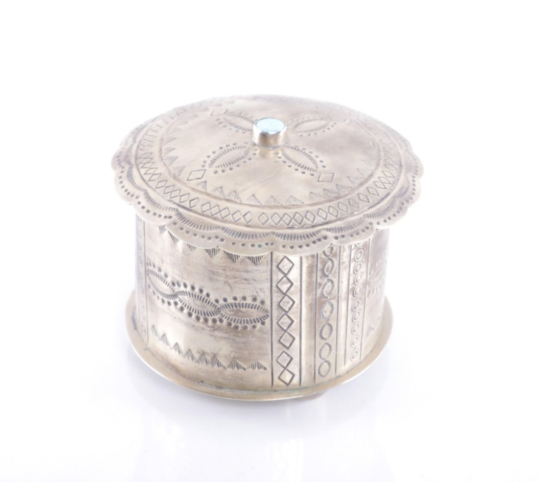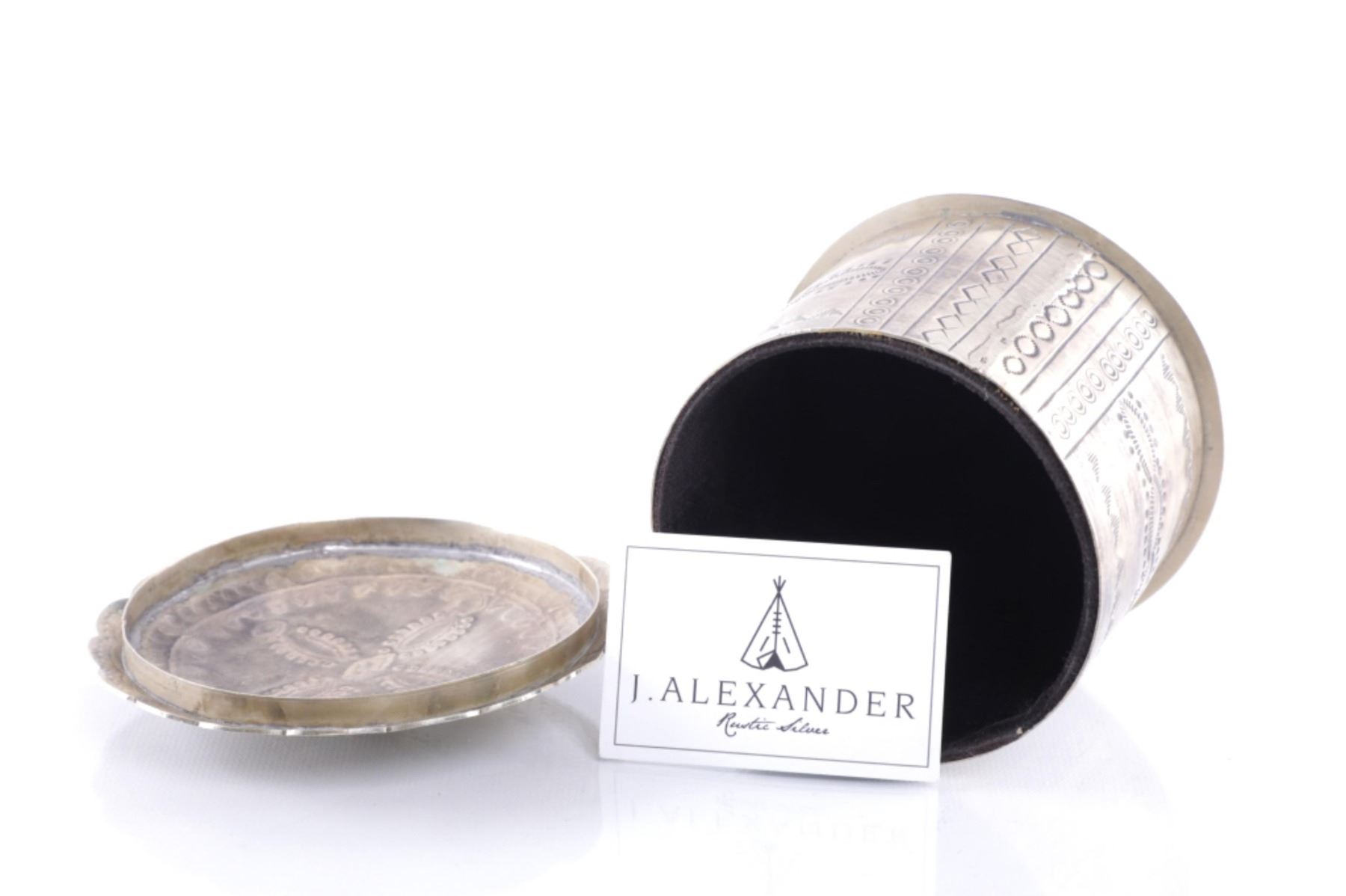 Featured in this lot is this fantastic German or nickel silver cylindrical box by J. Alexander with the amazing finish and styling that resembles the Navajo stamp work of the early 1900’s. The jewelry box features a cylindrical design with a scalloped edge lid with a set round blue gem turquoise cabochon set into the center of the lid. The side walling and lid are heavily tooled with geometric patterns around the center stone and the outside lips of the lid. Designed by Jason Lenox in Dallas, TX, this piece of rustic silver is handmade in a small village in the Central Highlands of Mexico. The work is done by one family and all the tooling is done by hand; no presses or stamps! The condition of this J. Alexander cylindrical box is good with no obvious signs of damage and shows good overall condition. The measurements of this cylindrical jewelry box is 4" x 4 7/8" x 4 7/8". The collective weight of this jewelry box is 12oz.