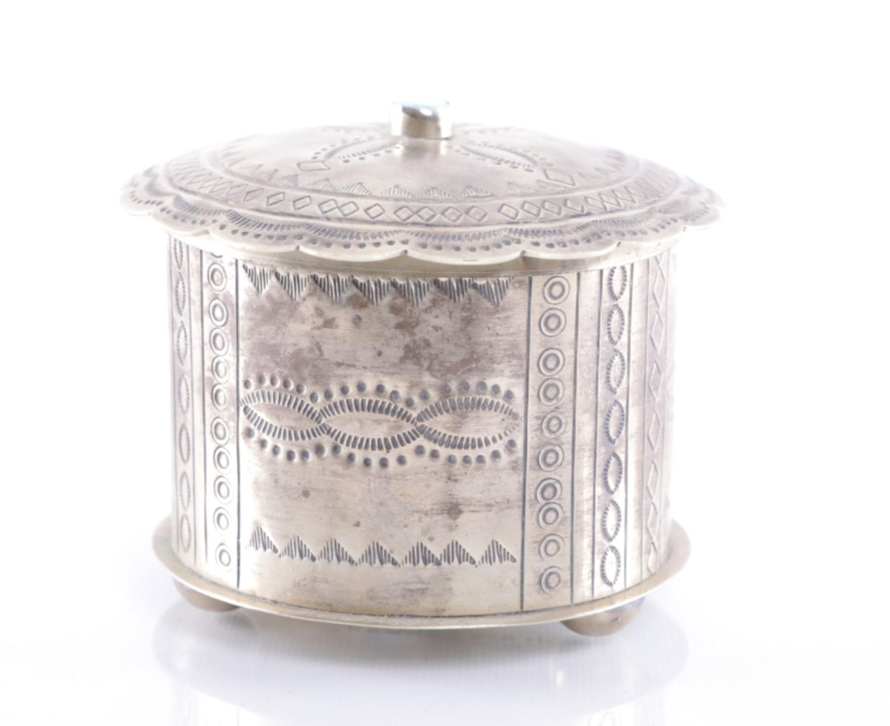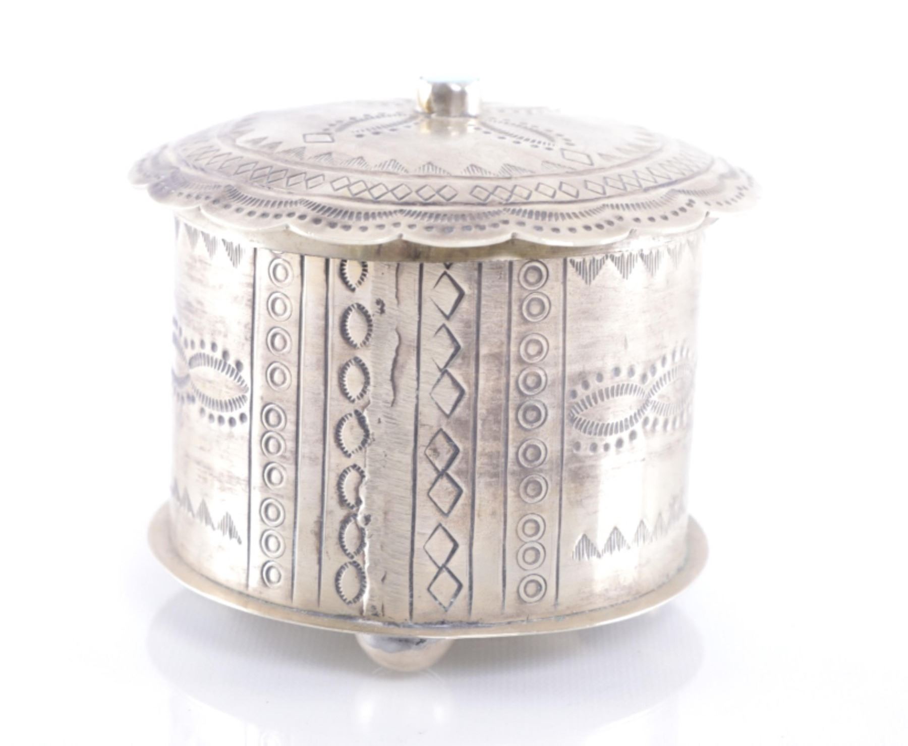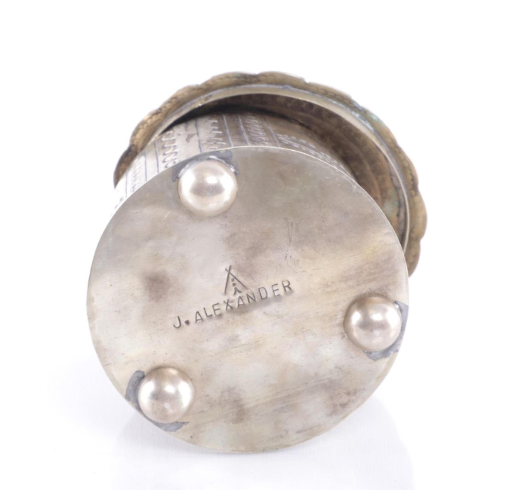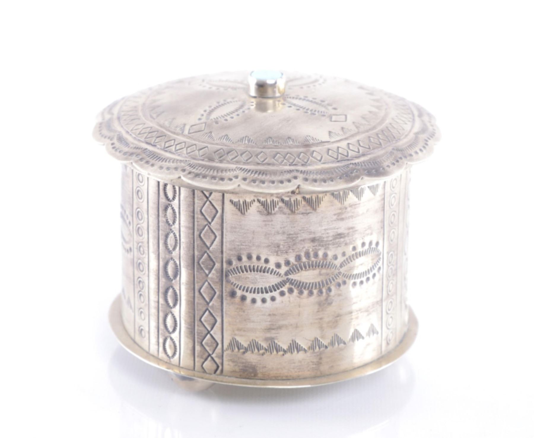 Featured in this lot is this fantastic German or nickel silver cylindrical box by J. Alexander with the amazing finish and styling that resembles the Navajo stamp work of the early 1900’s. The jewelry box features a cylindrical design with a scalloped edge lid with a set round blue gem turquoise cabochon set into the center of the lid. The side walling and lid are heavily tooled with geometric patterns around the center stone and the outside lips of the lid. Designed by Jason Lenox in Dallas, TX, this piece of rustic silver is handmade in a small village in the Central Highlands of Mexico. The work is done by one family and all the tooling is done by hand; no presses or stamps! The condition of this J. Alexander cylindrical box is good with no obvious signs of damage and shows good overall condition. The measurements of this cylindrical jewelry box is 4" x 4 7/8" x 4 7/8". The collective weight of this jewelry box is 12oz.