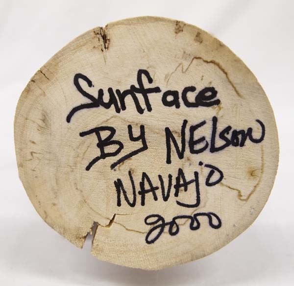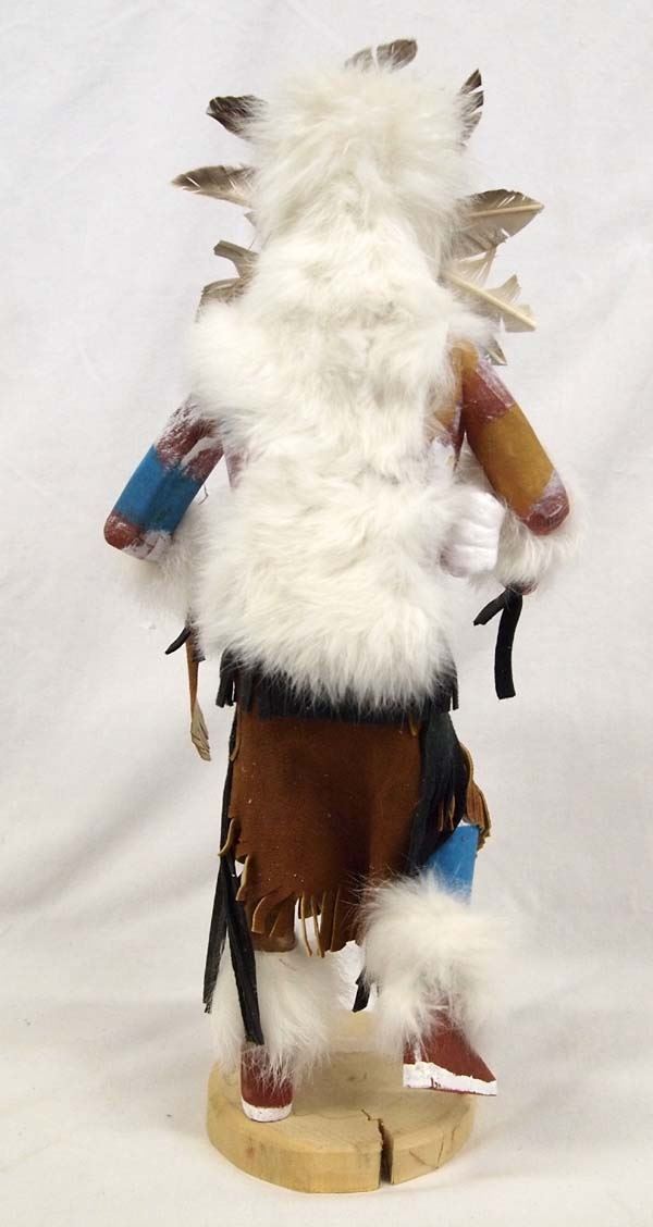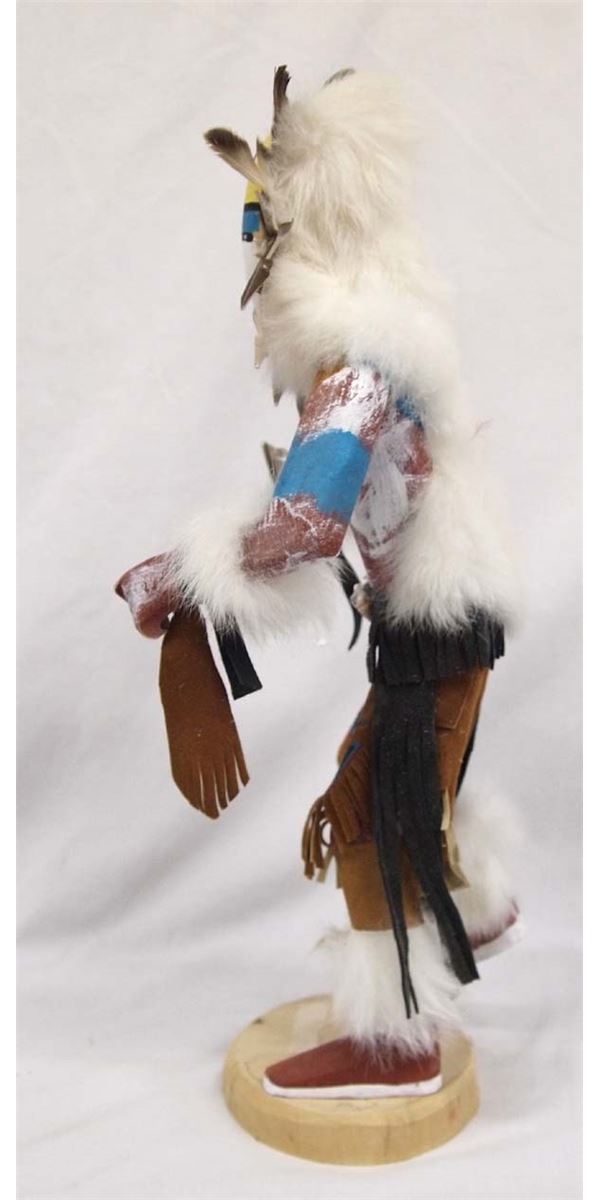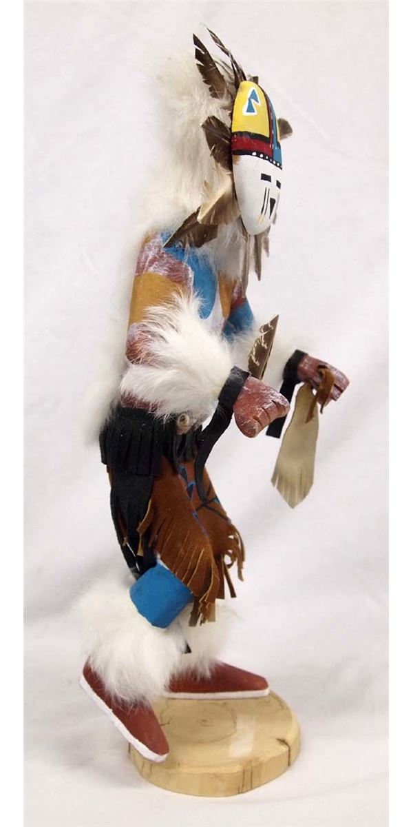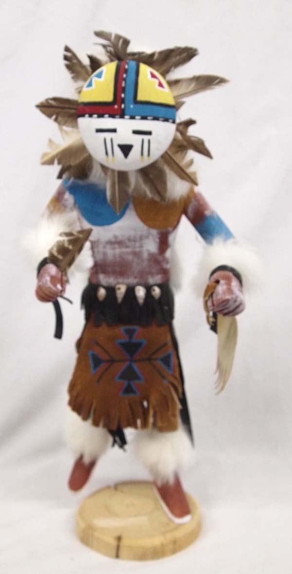 Native American Navajo Sun Face Kachina signed by artist Nelson. Adorned with feathers, leather, shells and fur this piece stands 16'' tall and is 7'' wide. Titled ''Sun Face and made by artist Nelson in 2000.