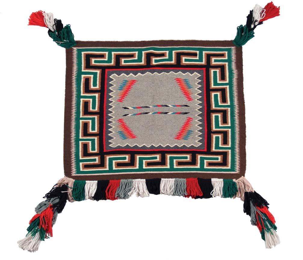 Navajo Sunday Saddle Blanket. 34" x 29" plus fringe & tassels. Circa 1970s. (est $700-900). For condition reports please visit: www.auctioninsantafe.com/cr2011.pdf