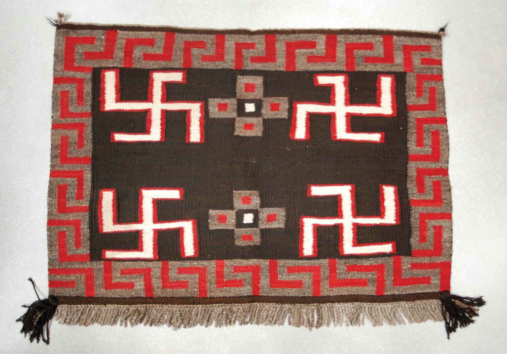 Dark center section with four swastikas or whirling logs and rectangles. Red and gray border, fringe and tassels. Natural and aniline dyed wool. Excellent condition. 28" x 38", circa 1920s.