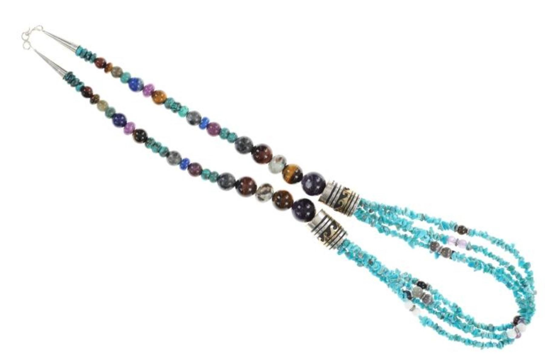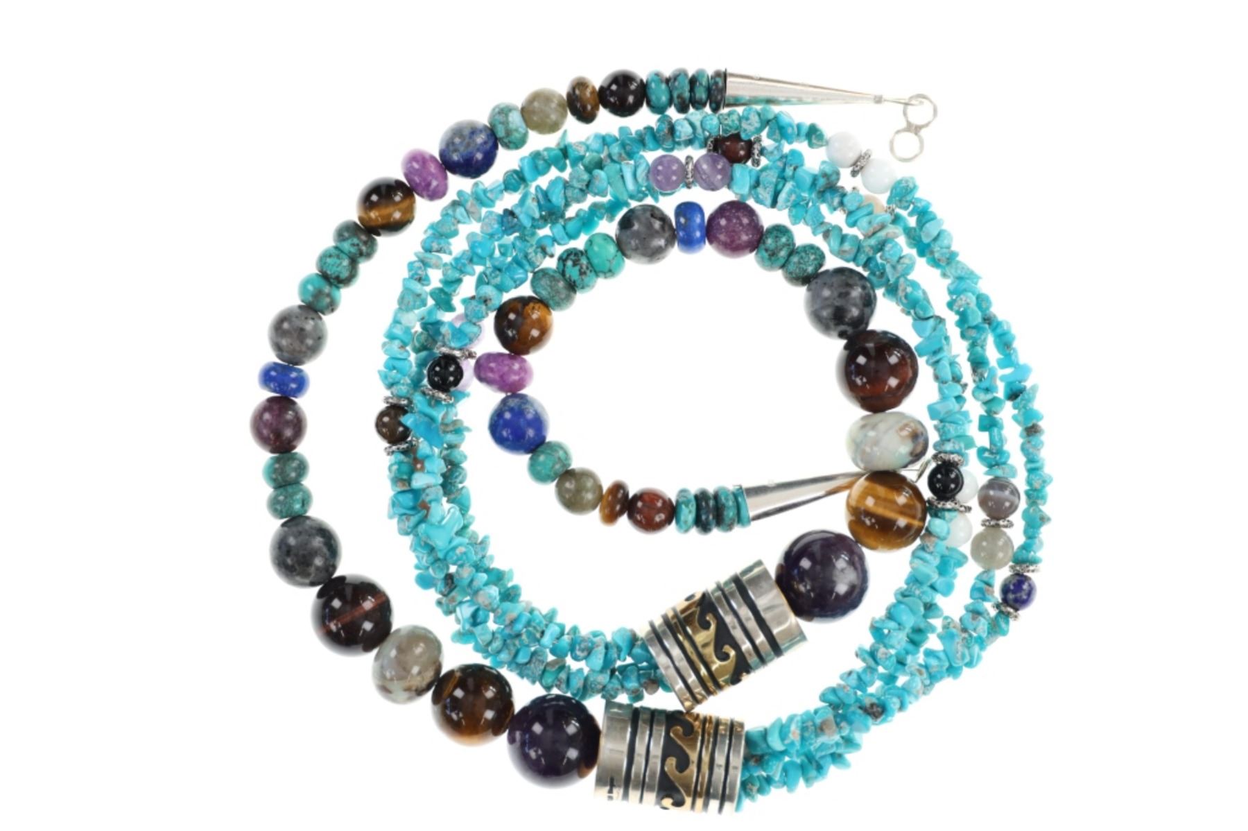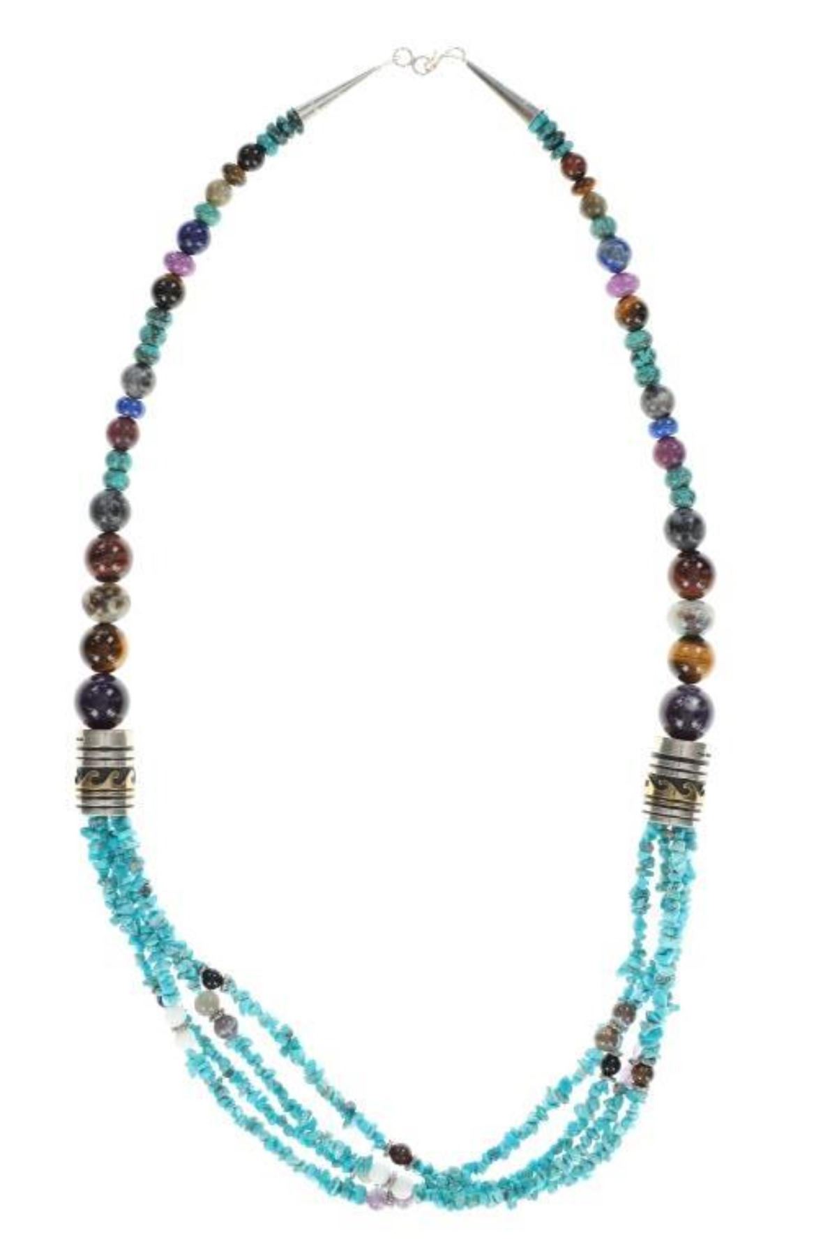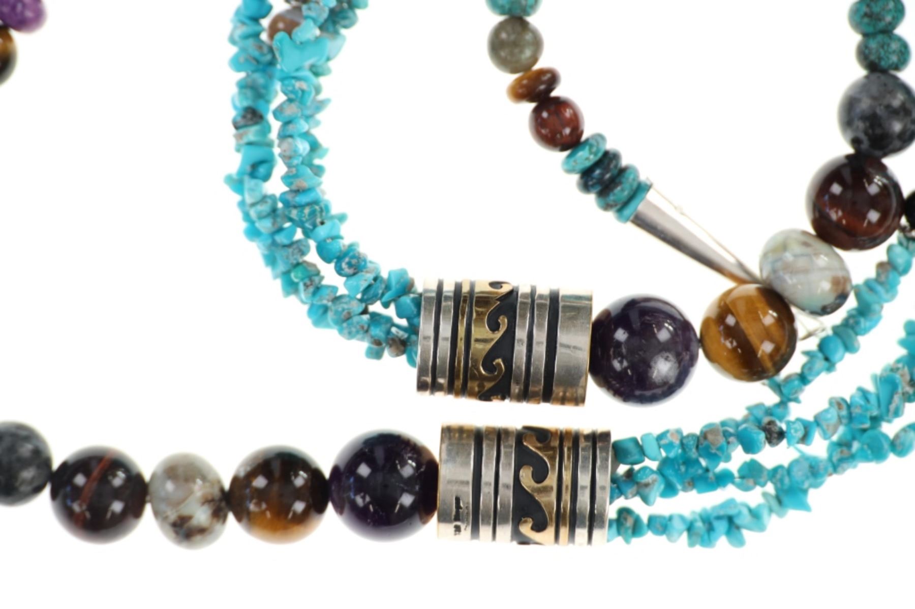 Featured in this lot is this 3 strand multistone necklace from Navajo Tommy and Rose Singer. The necklace features a wonderfully and professionally crafted multistone and sterling silver and 14k gold construction that shows a triple strand with nugget turquoise and amethyst, jet, and marble with larger spherical stone of a variety of agate, jet, tigers eye, and jasper. The barrel beads show a sterling silver and 14k gold construction that are marked as follows: T & R Singer - Sterling. The condition of this Navajo necklace is good with no obvious signs of damage and shows good overall condition. The measurements of this necklace from clasp to clasp is 30 1/2". The collective weight of this necklace is 133.8g.