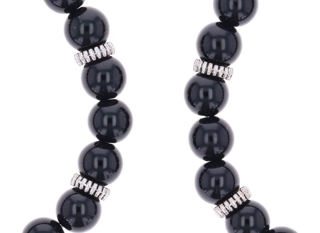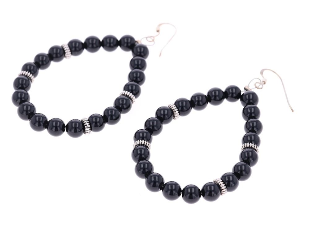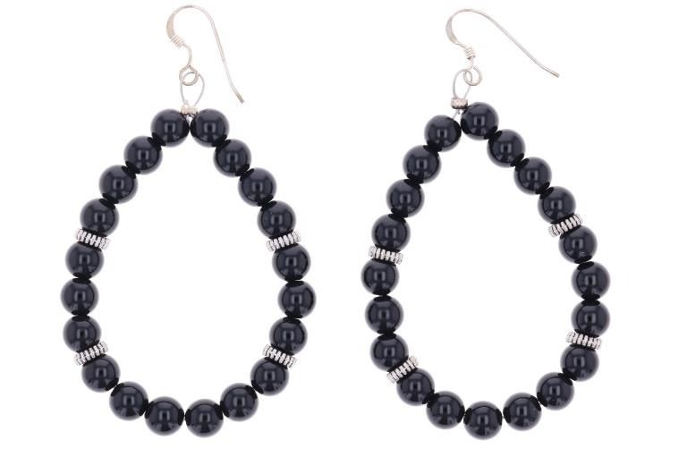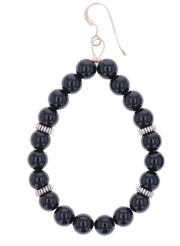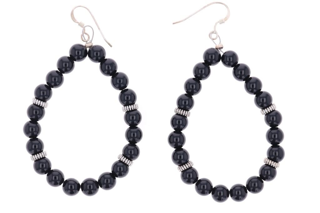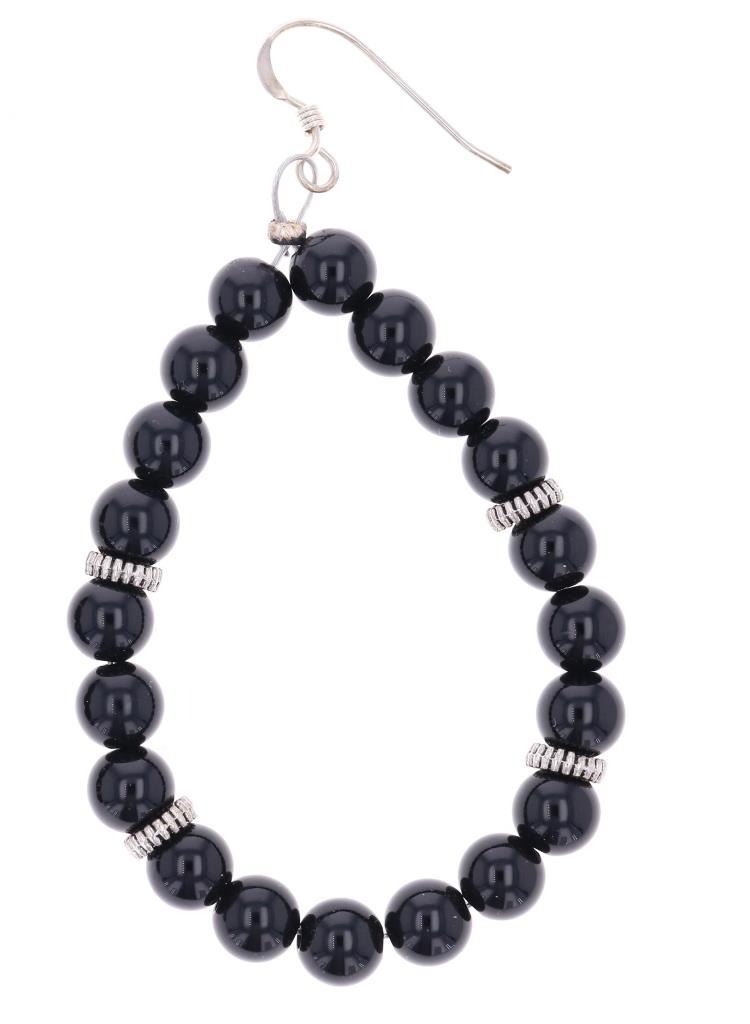 Featured in this lot is this sterling silver onyx earrings from Navajo artists Tommy and Rose Singer. The earrings feature a wonderfully and professionally crafted sterling silver and onyx construction that shows spherical onyx beads strung on a core with sterling silver discs. The earrings are marked with the artist signature on the earring clasps. The condition of this pair of Navajo earrings is good with no obvious signs of damage and shows good overall condition. The measurements of this pair of earrings is 2 7/8" x 1 5/8". The collective weight of this pair of earrings is 14.7g.
