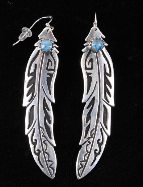 For your consideration is an astounding piece of authentic Navajo Native American sterling silver and turquoise jewelry by Tommy and Rose Singer. The piece shows a set of feather sterling silver dangle earrings bearing the “T&R STERLING” hallmark. Tommy Singer was a master Navajo silversmith artist whose pieces have captivated collectors for many decades. Tommy died in 2014 and his wife Rose continued to honor his legacy creating amazing jewelry based on the Tommy Singer designs he made before his death. The set shows a fine sterling silver construction with a beautiful feathered design and a deeply tooled pattern. The earrings feature a bezel set turquoise polished cabochon at the center. The piece is in excellent condition and each measure overall 3” x ½”.