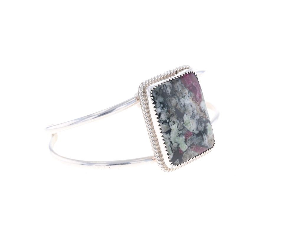 For your consideration is this sterling silver eudialyte bracelet from Navajo artist Terry Tsosie. The bracelet features a wonderfully and professionally crafted sterling silver construction that features a split bar frame and a twisted rope border to the center stone of rectangular cut eudialyte cabochon with colors of magenta, an attractive brown, black and grey. The bracelet is marked 'TT' and 'sterling' underneath the hallmark on the underside of the bracelet. The condition of this bracelet is good with no obvious signs of damage and shows good overall condition. The measurement of the eudialyte cabochon is 7/8" x 1" x 1/4" and the bracelet shows a circumference of approximatly 7". The weight of this bracelet is 22.2 grams.