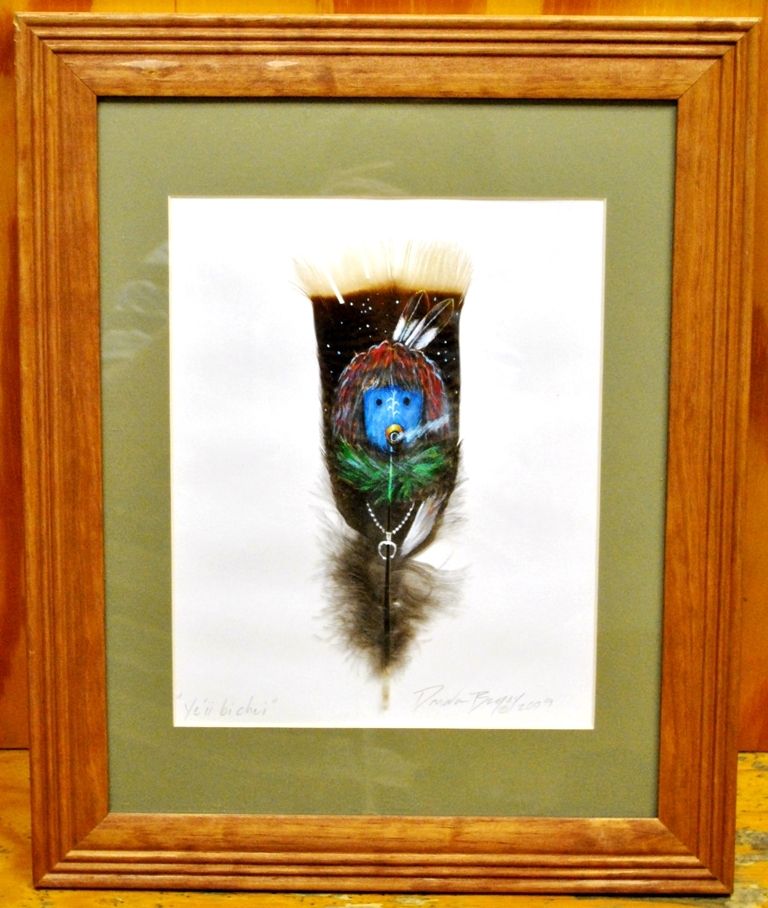 Painting is titled "Ye'ii Bichei". Frame measures 16-1/2" tall by 13-1/2" wide. Feather measures 9" tall by 3-1/4" wide.