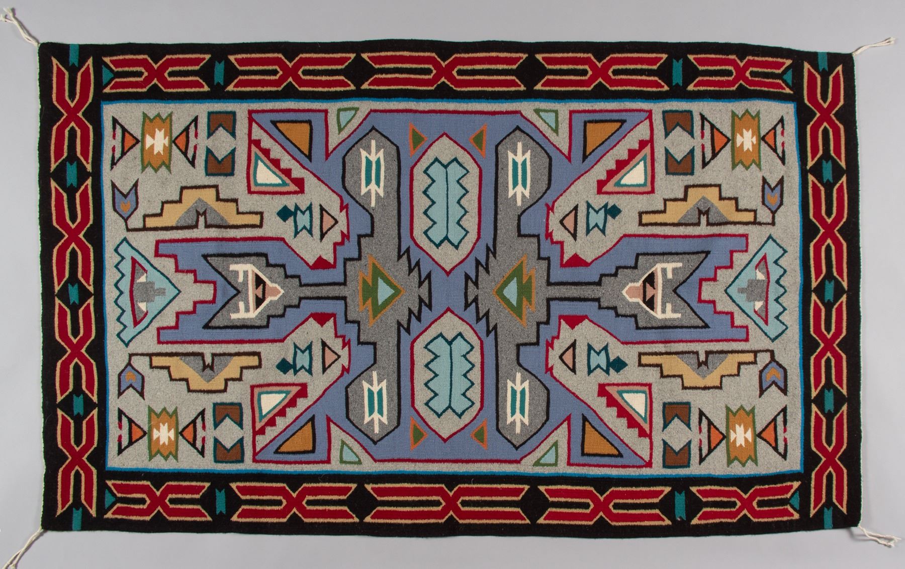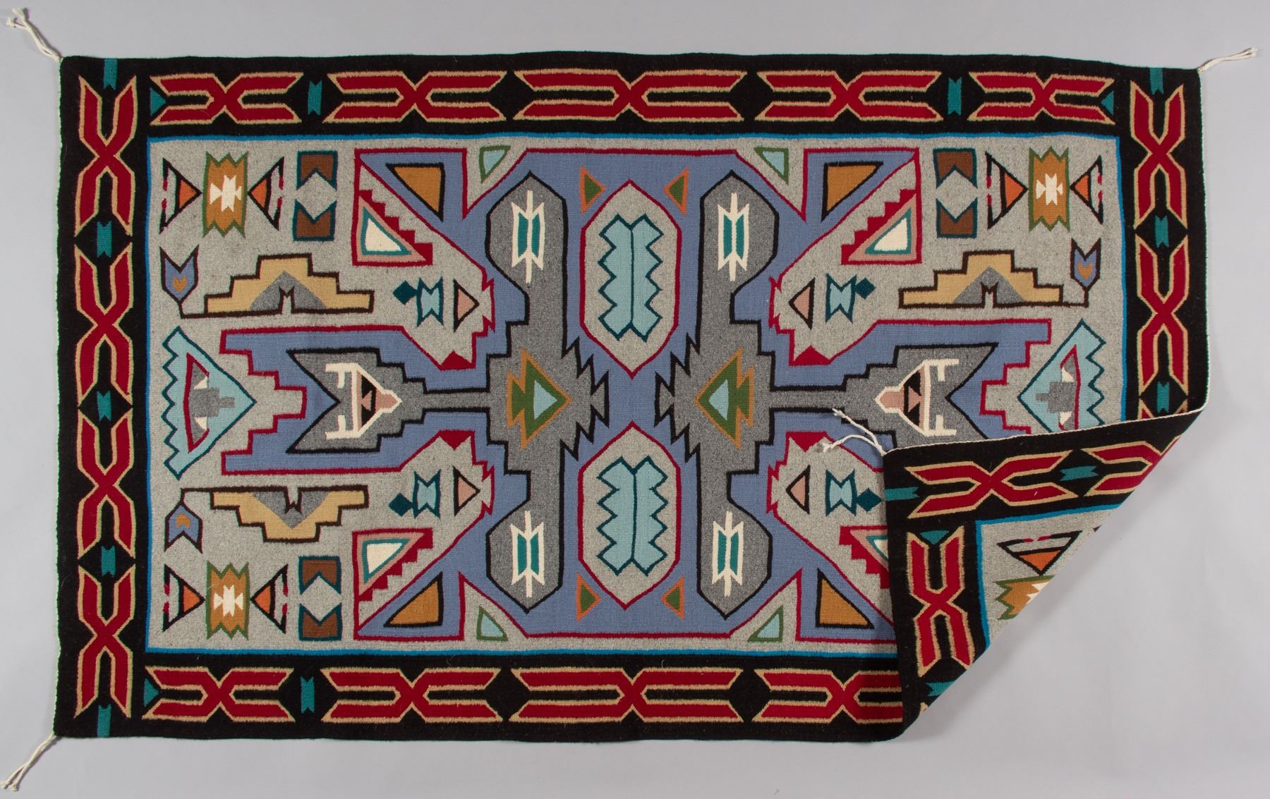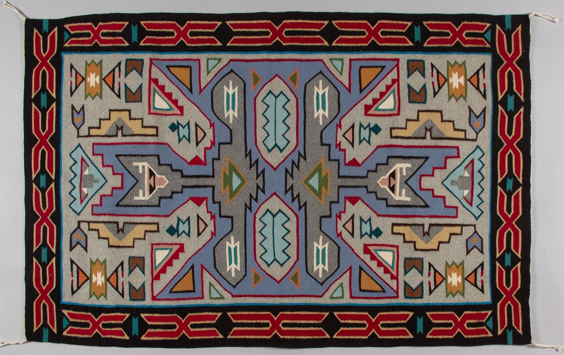A finely woven, vintage Navajo Teec Nos Pos regional rug, attributed to the esteemed weaver Mary White. This exquisite textile features the signature intricate and busy patterns characteristic of the style, often influenced by Persian rug designs. The central field is primarily a soft blue ground, bordered by a striking black and crimson border with traditional "X" motifs. The complex geometric design is executed in a rich palette of gray, yellow, white, red, and turquoise accents.