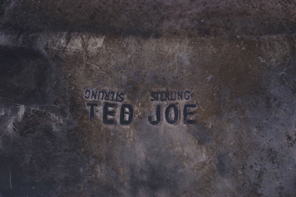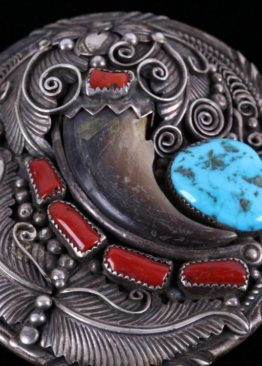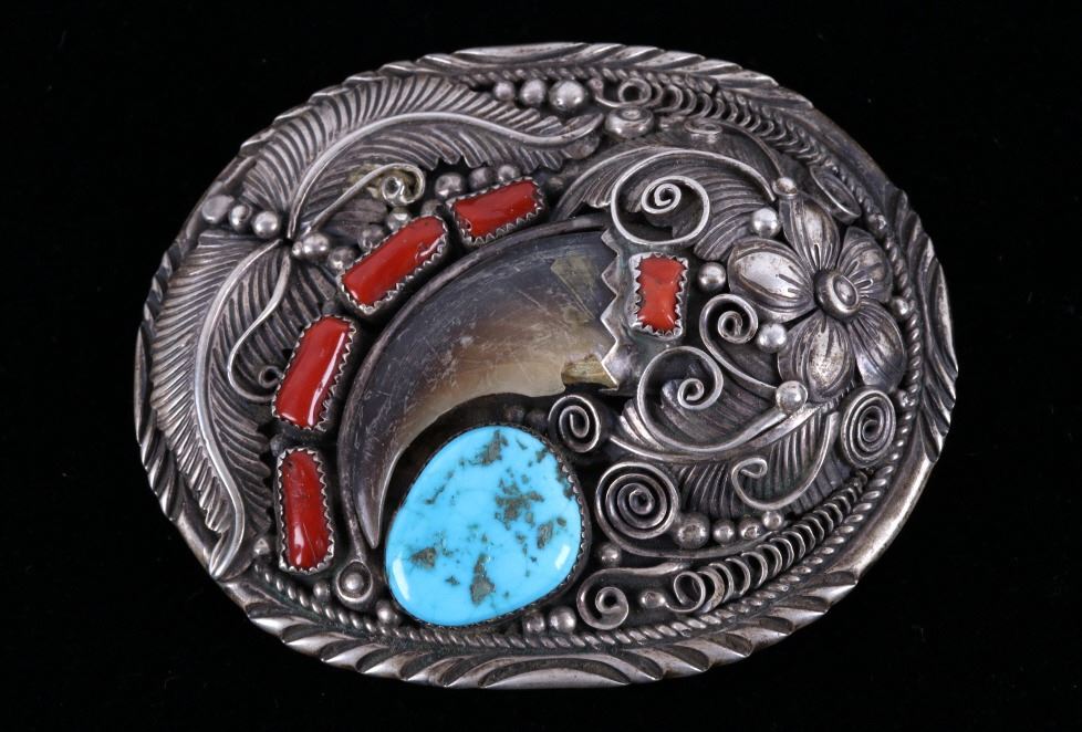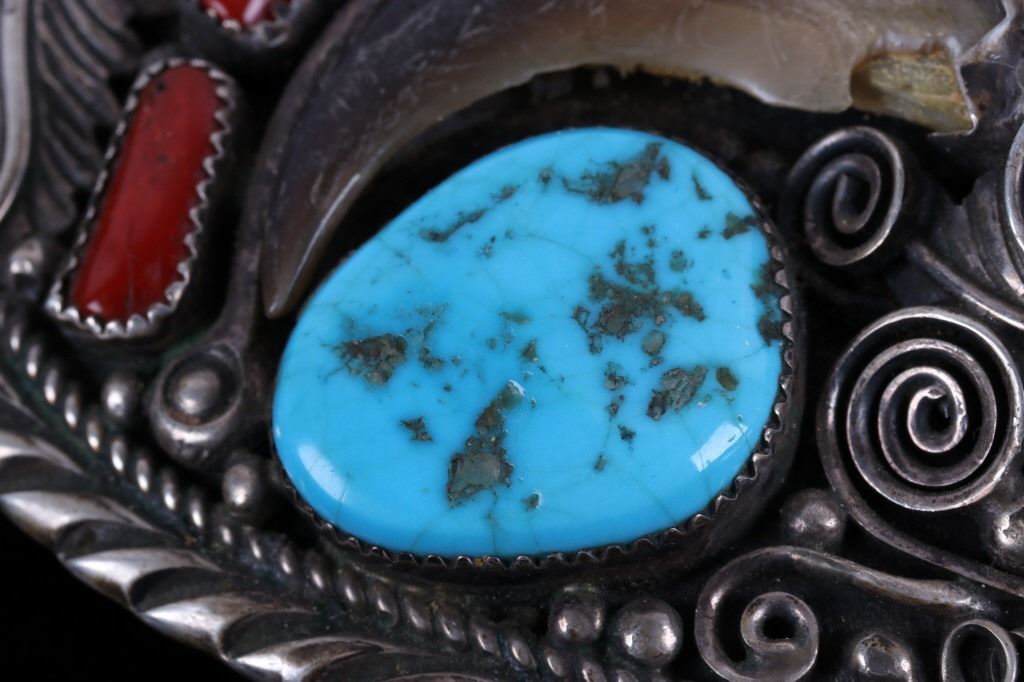 For your consideration is this Navajo Ted Joe bear claw Morenci turquoise and sterling silver belt buckle. This sterling silver belt buckle features five polished red branch coral gemstones and bear claw set into the face of the buckle. The piece shows wonderful iconic Navajo Native American Indian floral and feather design as a backdrop of this buckle. A large polished Morenci Turquoise gemstone also sits proudly in this design. The boarder of the buckle has a tightly wound silver braided rope accent and hand stamped design. The belt buckle is convex which adds a wonderful dimension to the design. The back is signed by the artist Ted Joe and stamped Sterling. The buckle measures 3 5/8” x 3”.