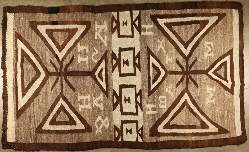 In gray and white with scattered lettering H, K, A,&M's. Measures 69"X41" Condition Fair fading and scattered losses, shows age.