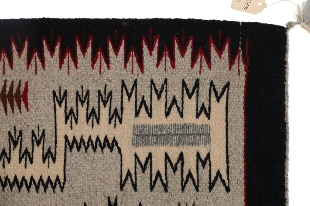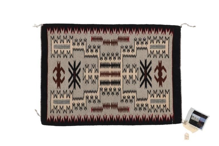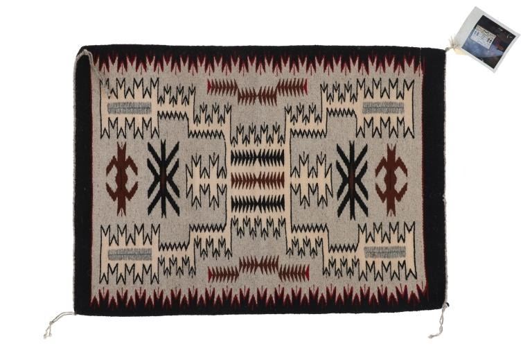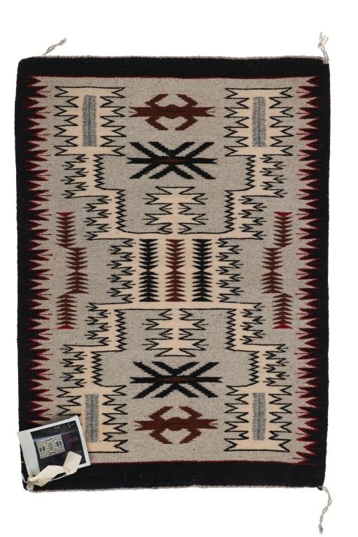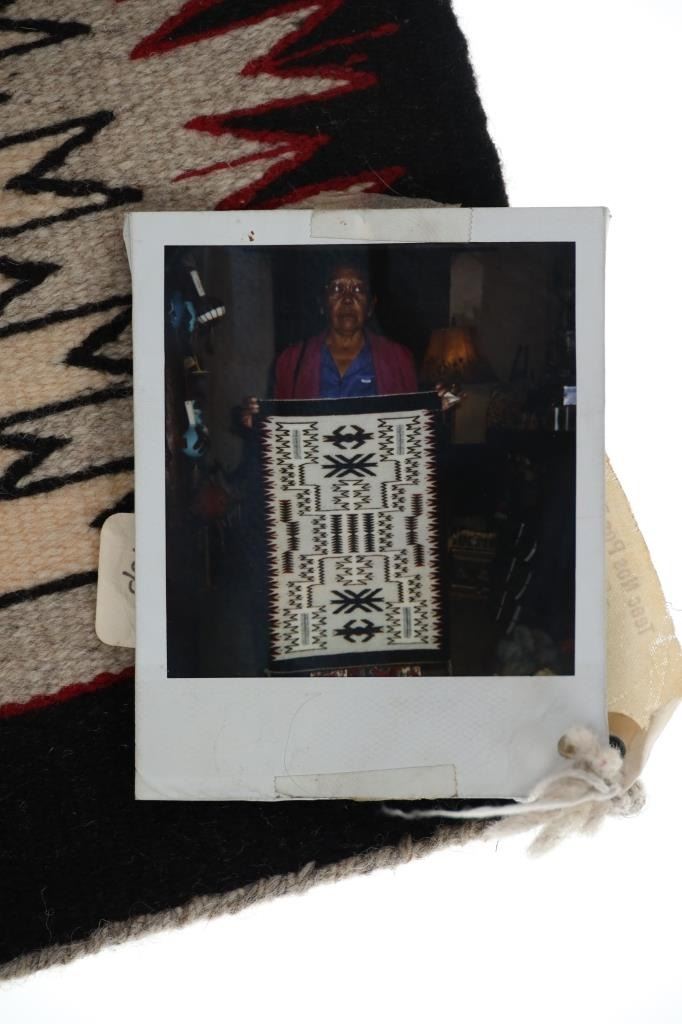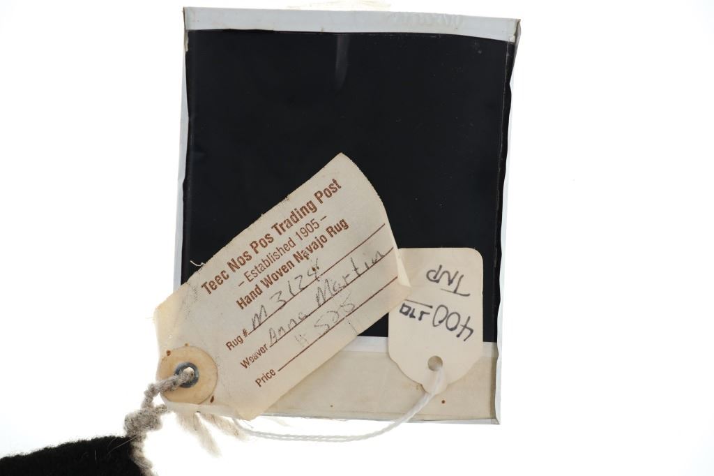 Featured in this lot is this Teec Nos Post Trading Post from Navajo artist Anna Martin circa 1960's. The rug features a wonderfully and professionally crafted wool construction that shows a classic Teec Nos Pos design with central decoration of geometric patterns and includes coloration of blck, red, and off white set to a grey field. The rug comes complete with a original poloroid of Anna Martin and an original Teec Nos Pos Trading Post tag. The condition of this rug shows shows a tight weave with good consistent natural dye coloration and acute lines that make up the decoration of the rug. The measurements of this rug is 29 1/4" x 21". The thread count is 247 threads per square inch.