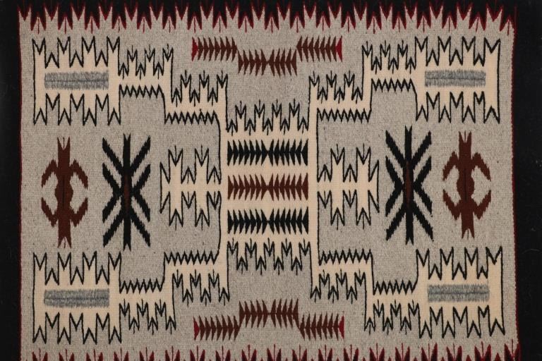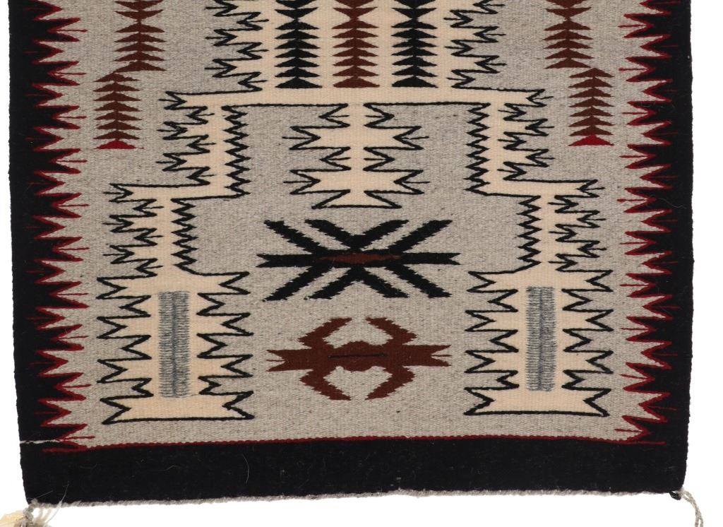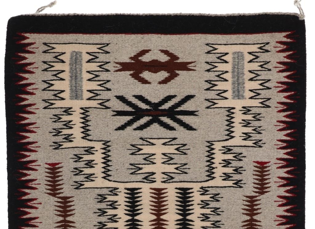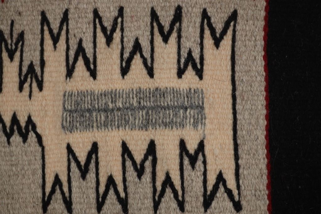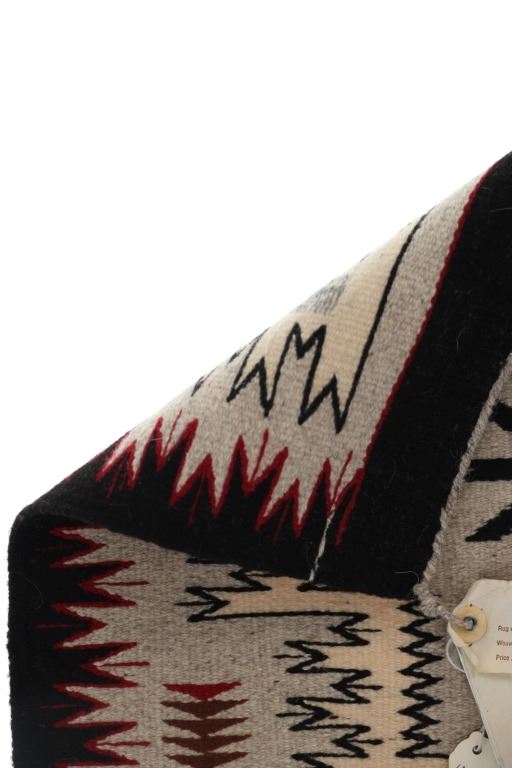 Featured in this lot is this Teec Nos Post Trading Post from Navajo artist Anna Martin circa 1960's. The rug features a wonderfully and professionally crafted wool construction that shows a classic Teec Nos Pos design with central decoration of geometric patterns and includes coloration of blck, red, and off white set to a grey field. The rug comes complete with a original poloroid of Anna Martin and an original Teec Nos Pos Trading Post tag. The condition of this rug shows shows a tight weave with good consistent natural dye coloration and acute lines that make up the decoration of the rug. The measurements of this rug is 29 1/4" x 21". The thread count is 247 threads per square inch.