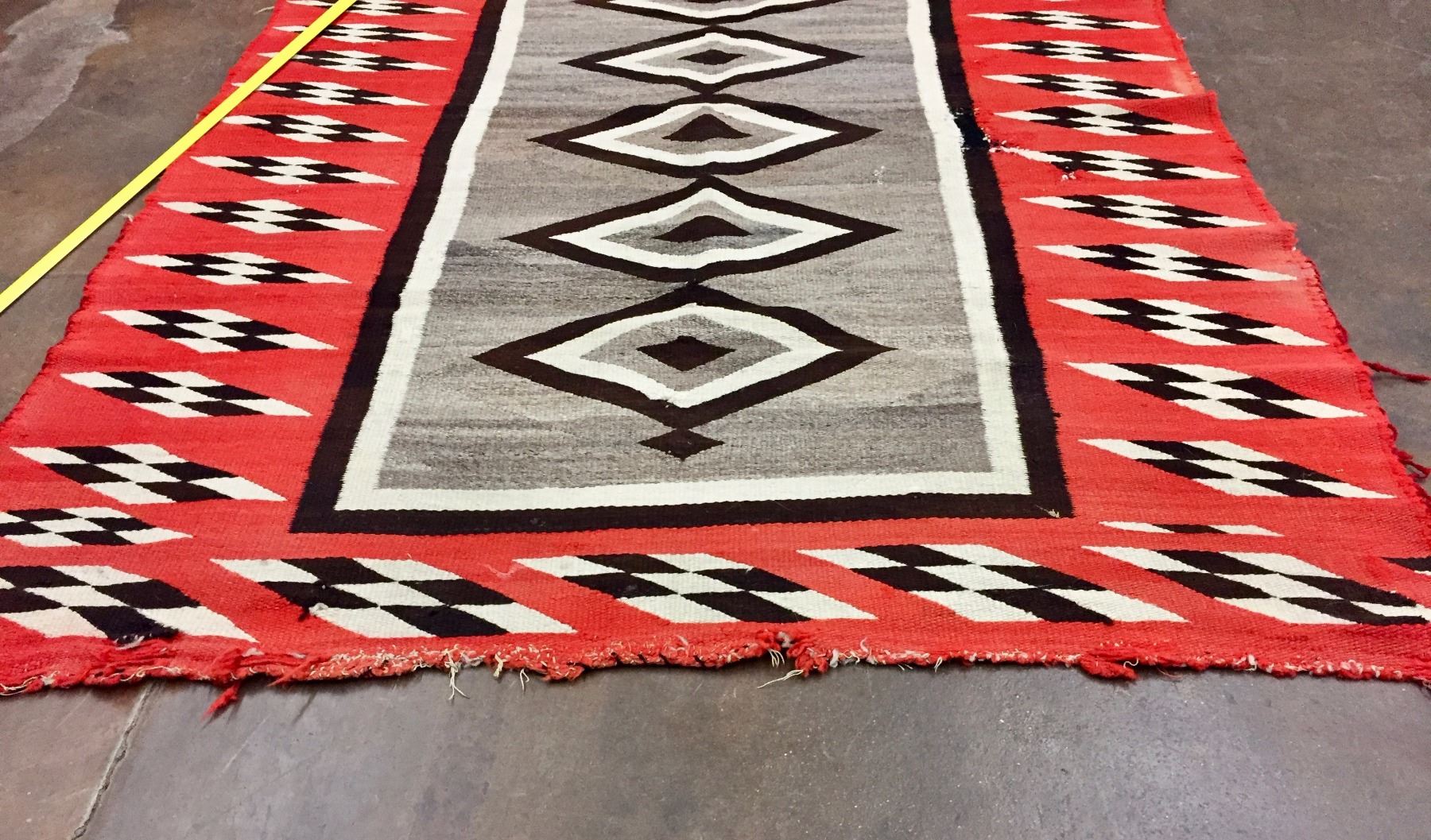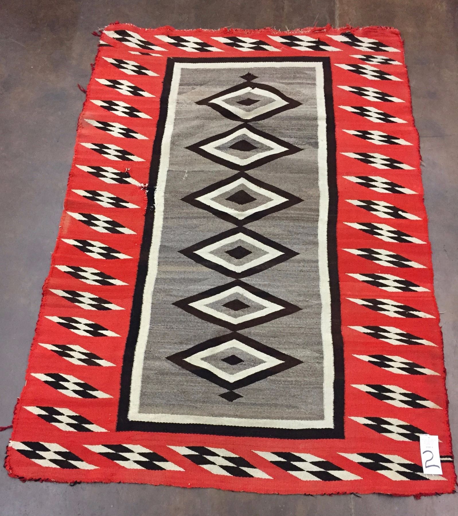 Description: Vintage Navajo textile. Maker: Unknown Navajo weaver. Approx. Age: Circa 1920s. Size: Textile measures 72” l x 50” w. Condition: Fair for its age, wear, fading, holes, etc. expected. Please look closely at the pictures - they are an important part of our description. Shipping: There will be a $5 handling / packaging fee for shipping this lot. The actual cost of postage will be added on top of that.