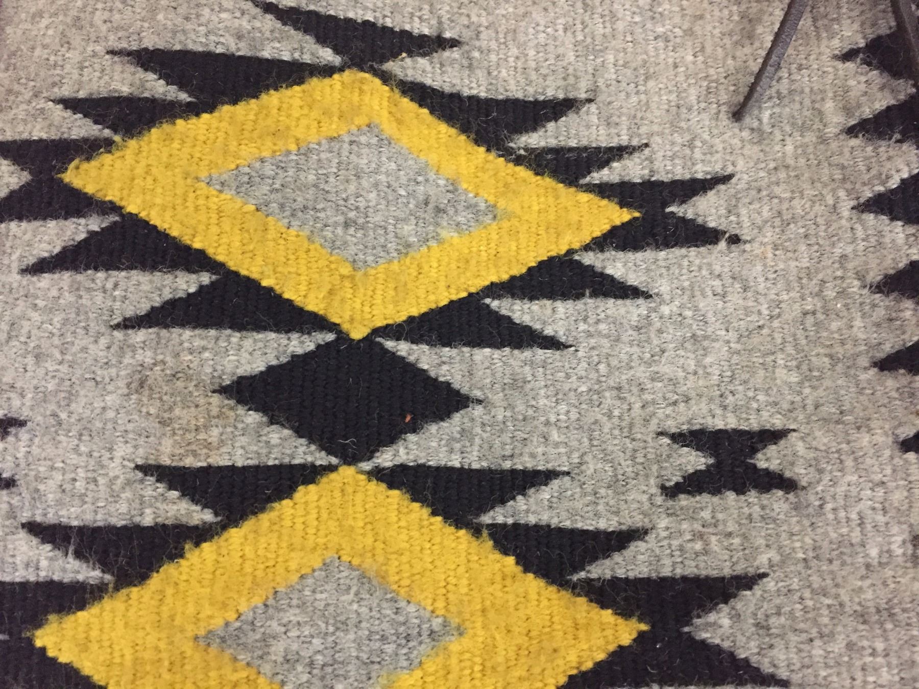 Maker: Unknown Navajo weaver on the vintage textile and the leather work is by TK custom leather. Approx. Age: A vintage textile recently turned into a handbag. Size: Measures 11 7/8” w x 10 3/8” h. Strap extends 13” off the shoulder. Additional Info: Black, grey and yellow Navajo textile handbag with black leather straps and fringe. Condition: Good for it’s age, normal wear expected. Please look closely at the pictures - they are an important part of our description. Shipping: There will be a $5 handling / packaging fee for shipping this lot. The actual cost of postage will be added on top of that.